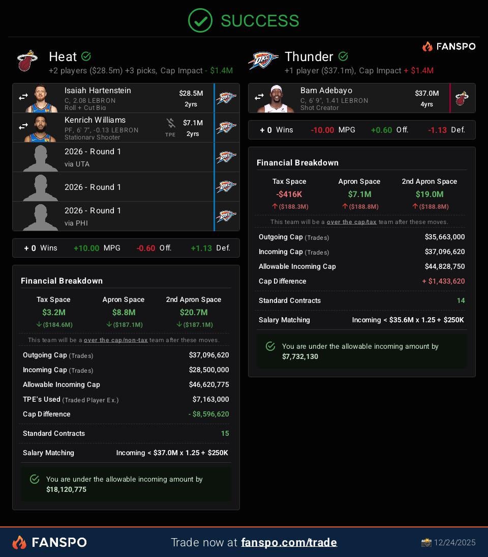 I would do that in a heartbeat. I think you could flip Hartenstein to another team for more value. It’s win win. Bam gets to win a title somewhere else, and we get a jump on our rebuild.