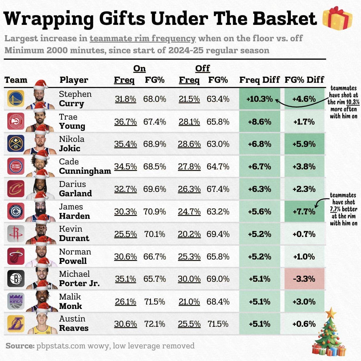 Largest contributors to teammate rim frequency since start of last season. (Garland is 5th)