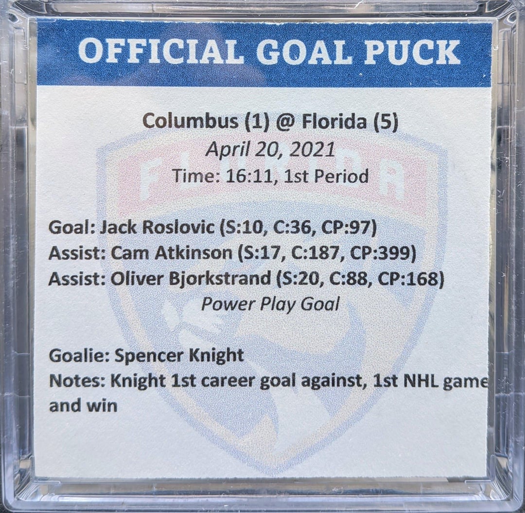 Stoked to land this game-used goal puck from Spencer Knight’s NHL debut game! His first and only goal allowed in his debut game + first career win on April 20th 2021.