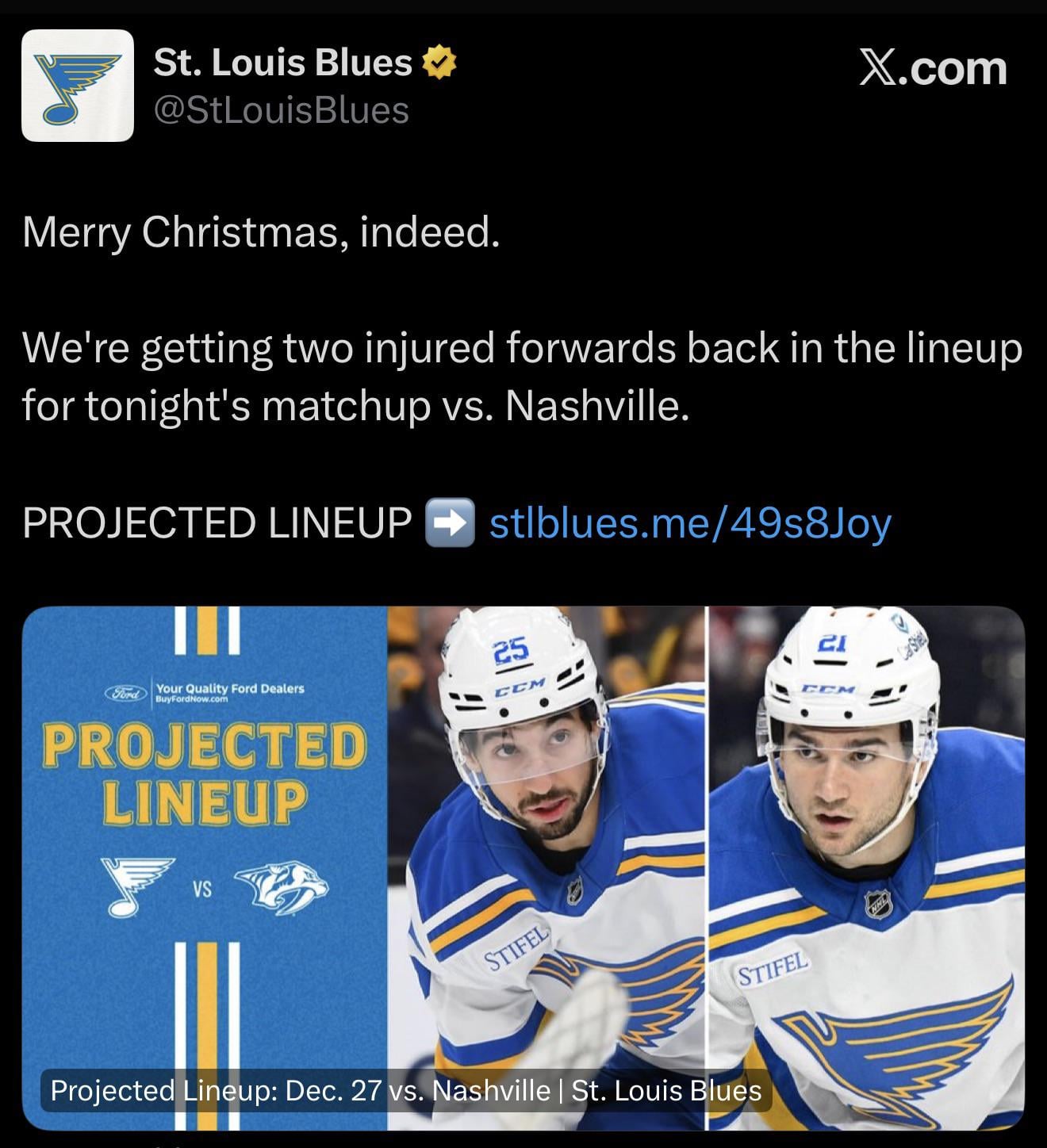 https://x.com/stlouisblues/status/2004967209882591605?s=46&t=o5KPlxx9o4pGWdh9FplXLw 5 comments I like the Suter, Divorsky, Snuggerud line… Hope they get a decent amount of ice time. Too bad Joseph can’t be in there tonight. Buch still on the top line 😡  What steroids are the blues doctors prescribing to these guys? Lol Huge boost having them back Leave a ReplyYou must be logged in to post a comment.