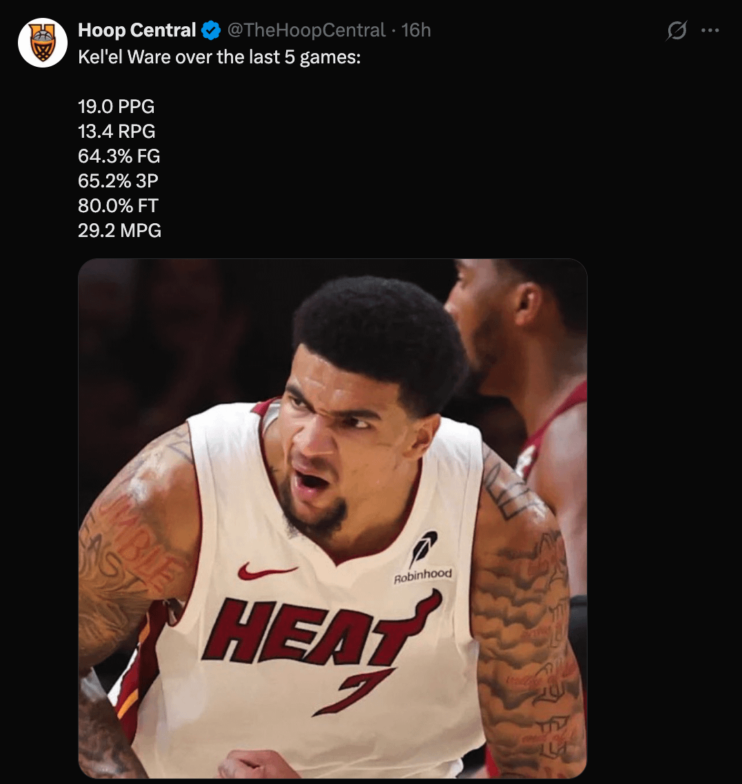The Kryptonian: 19.0 PPG // 13.4 RPG // 64.3% FG // 65.2% 3P π₯π₯π₯ 12 comments Side note: There are days I struggle with the idea of putting together a package of: * Ware * Herro * Jaime * Kas * two firsts * Rozier (expiring) for Giannis. Two days ago, I was fully on board. Yesterday, I changed my mind because I like Ware a lot. Ooof. Ware is pretty good at basketball I think The Warelock https://preview.redd.it/bfxzq0zops9g1.jpeg?width=1024&format=pjpg&auto=webp&s=c40e36239931c4f0139d4ac9560c8233d99d1737 Feels like some nights he easily sleepwalks into these stats. Kβelel Ware is more valuable to this franchise than a past-his-athletic-prime Bam Adebayo long term He is going to be an annual all-star and his ceiling is the sky. Went from the future, to the present in 2 months  has anyone already come up with this nickname? His nickname is the Warewolf! LOVE what Iβm seeing from WarehouseβΌοΈ The Warewolf Top 4 player on the roster Leave a ReplyYou must be logged in to post a comment.