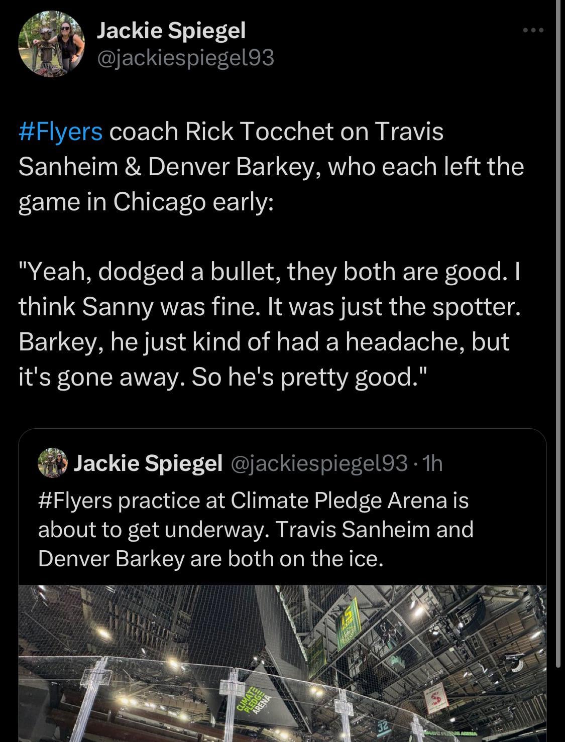 [Spiegel] Flyers coach Rick Tocchet on Travis Sanheim & Denver Barkey, who each left the game in Chicago early:”Yeah, dodged a bullet, they both are good. I think Sanny was fine. It was just the spotter. Barkey, he just kind of had a headache, but it’s gone away. So he’s pretty good.”