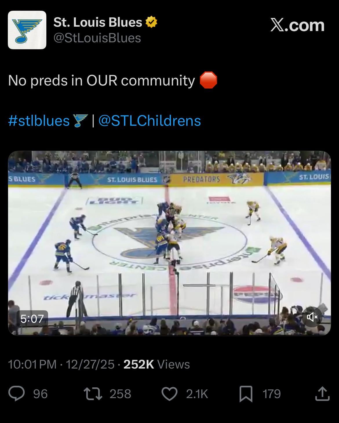 [St Louis Blues] No preds in OUR community π@STLChildrens 3 comments The caption + tagging childrenβs hospital is too good. A+ for the Blues social team! Tagging STL Children’s is amazing Don’t you guys have Mailloux, DubΓ©, and Lucic in your organization? Predator trifecta right there… Leave a ReplyYou must be logged in to post a comment.