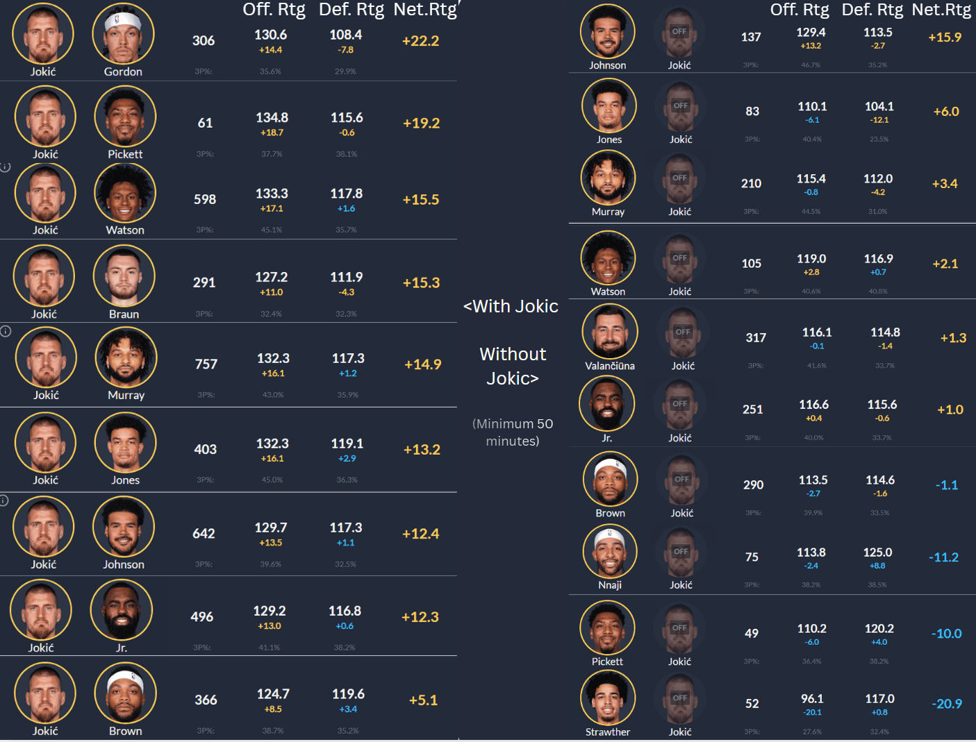 This is from last year, and it shows the same pattern. Pickett is actually very serviceable and good with Jokic, but is essentially doing cardio without him.