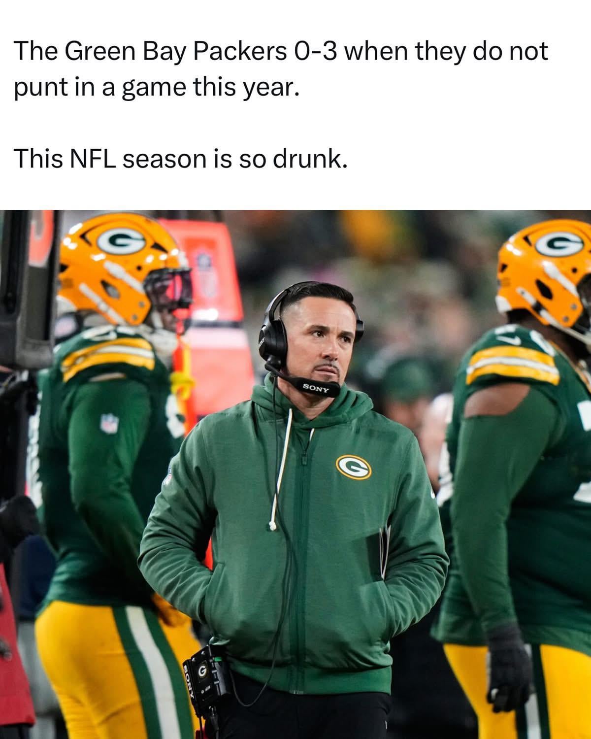 Your drunk 7 comments “GO FOR IT”- wasn’t a great strategy Yes maybe we all need to remember this stat next time the “analytics” say go for it. What do we have here? Failed 4th downs? Missed kicks? Punting is winning So yhe Packers need to start with 3 and outs for the rest of the season. Turnovers will do that Why punt when you can run out of the shotgun on 4th and inches Leave a ReplyYou must be logged in to post a comment.