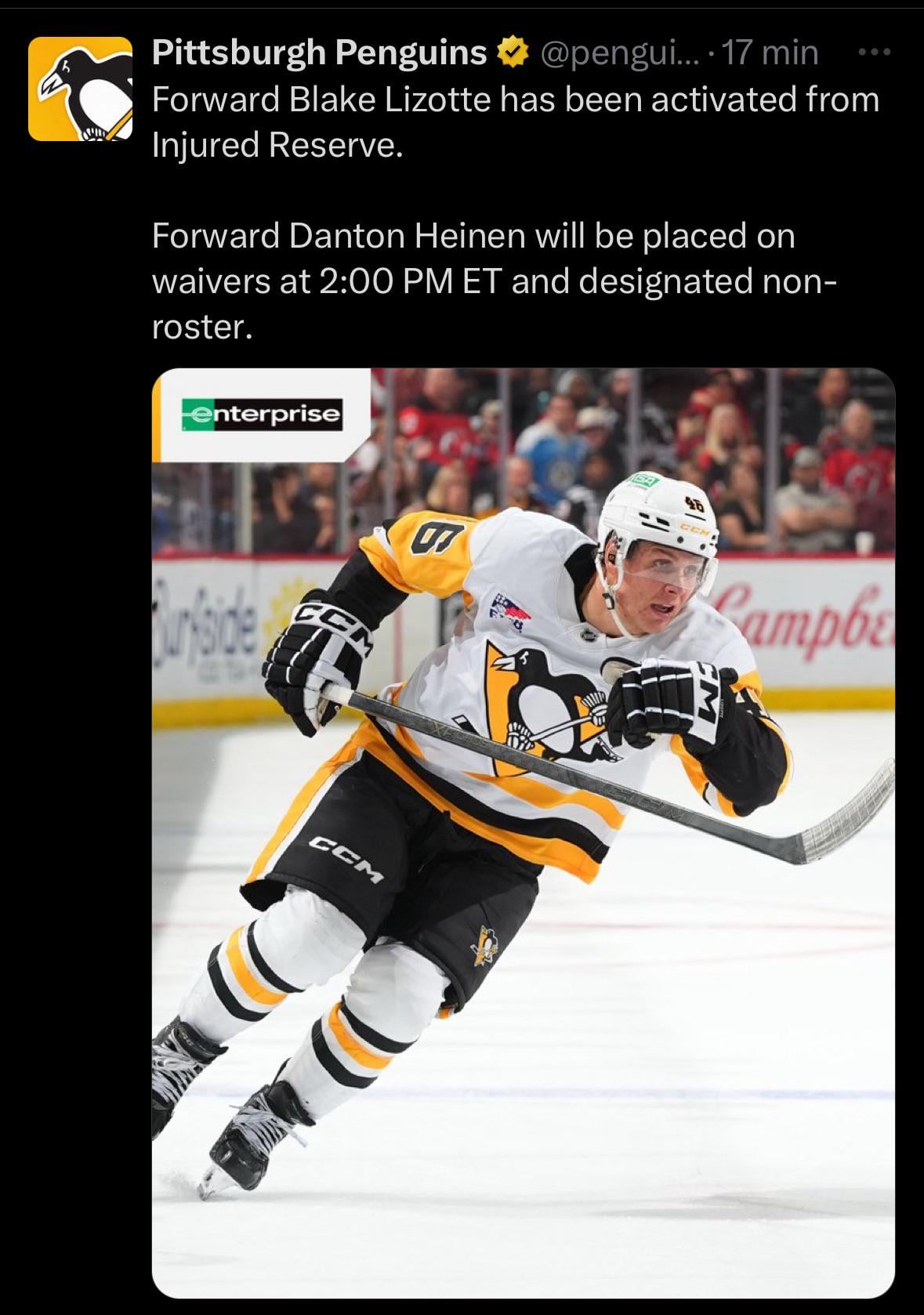 [Penguins] Forward Blake Lizotte has been activated from Injured Reserve. Forward Danton Heinen will be placed on waivers at 2:00 PM ET and designated non-roster.