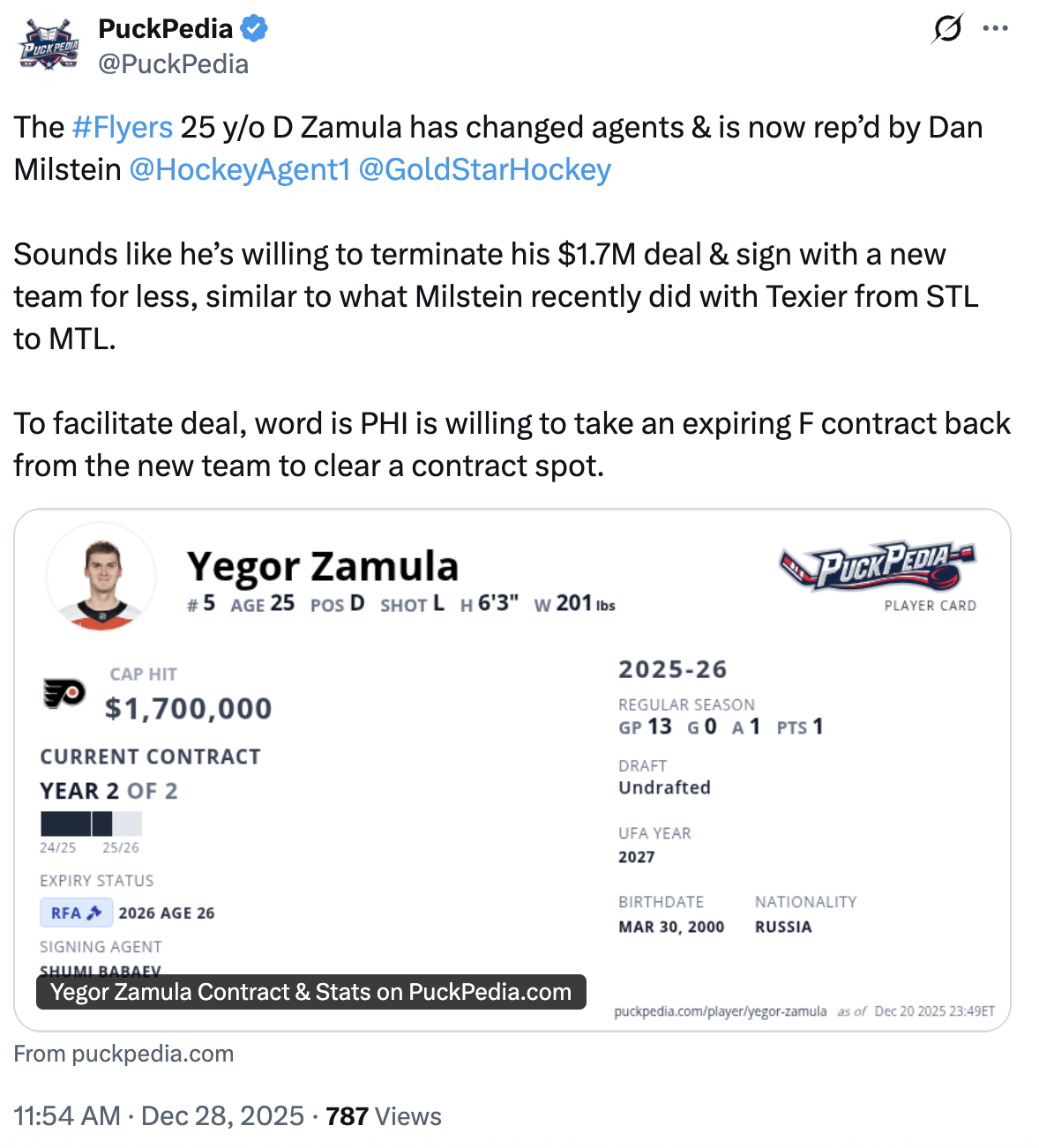 [PuckPedia] Zamula has changed agents and is now rep’d by Dan Milstein. Sounds like he’s willing to terminate his $1.7M deal & sign with a new team for less…To facilitate deal, word is PHI is willing to take an expiring F contract back.