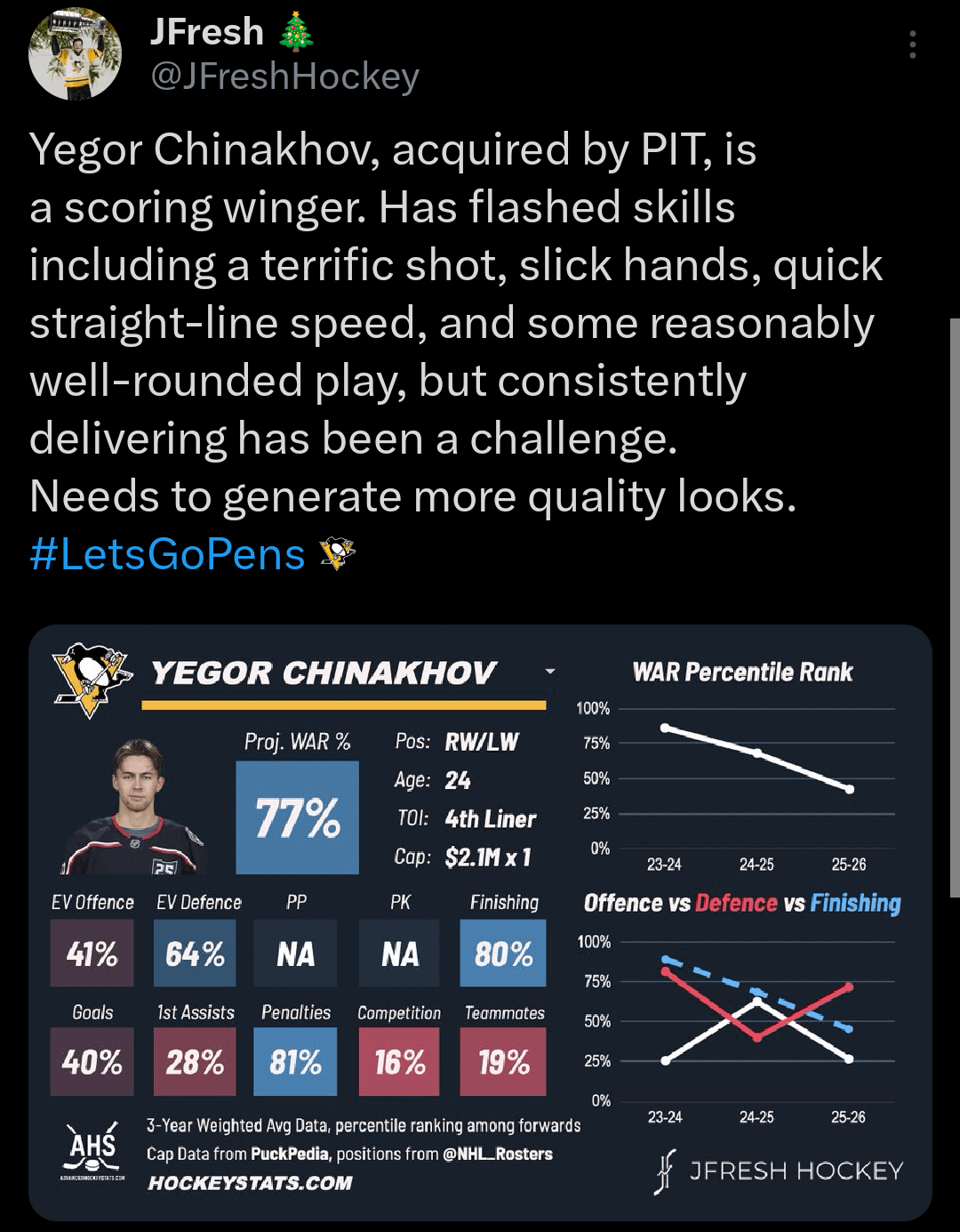 6. Dude isn’t invested in team defense but has a decent shot. He definitely sounds more like a pens player than cbj. I gotta imagine they see something special considering what they gave up. That feels a little higher than “flyer” price tags. Say what you want about those picks but they could really use some prospect depth, especially defensively.