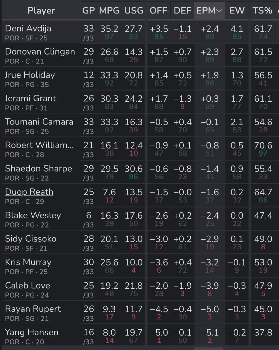 So for example Yang has a red 2 under EPM, that means he has been less impactful in his minutes than 98% of the entire NBA.