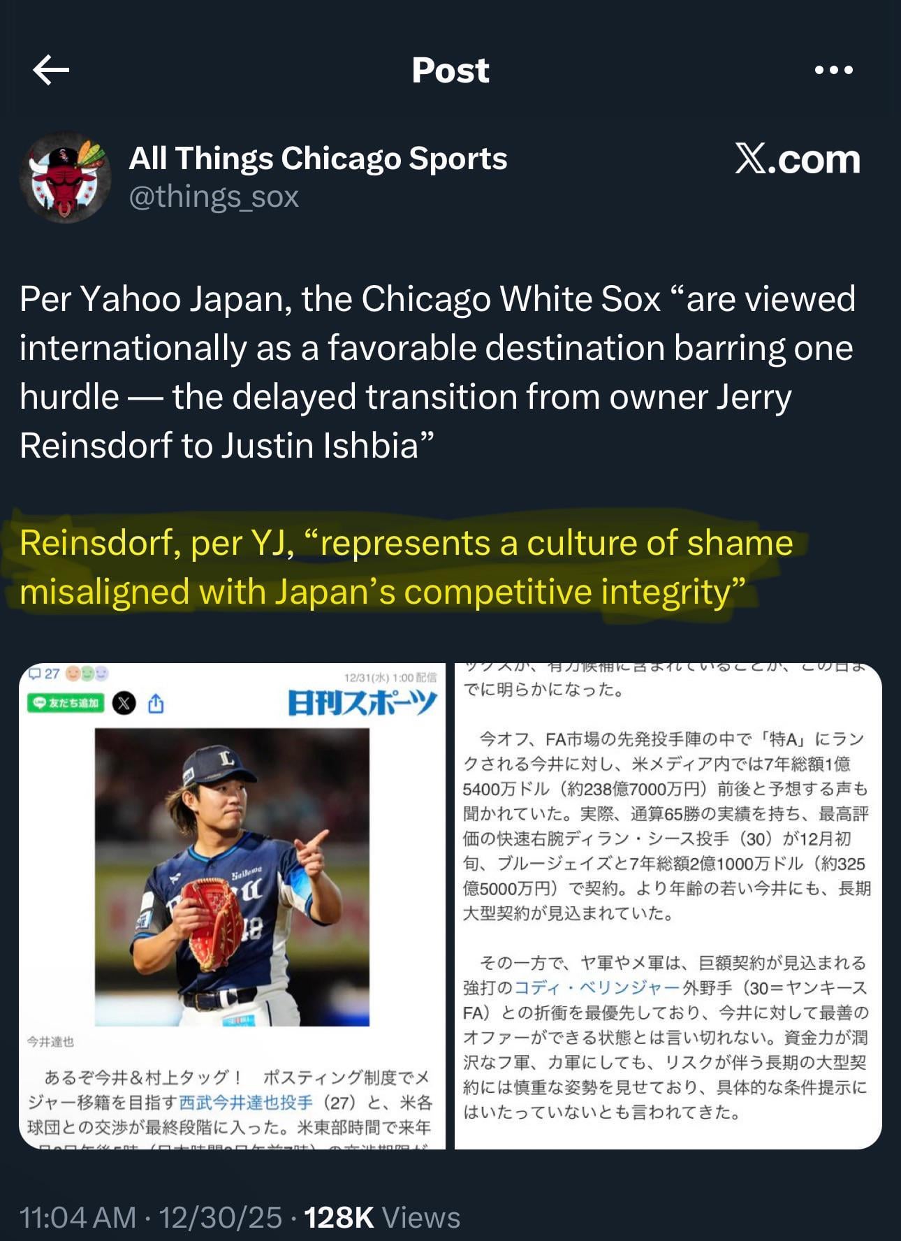 Our new Japanese fans also already hate Jerry Reinsdorf. They are learning quick! 12 comments As a person whose overall happiness is unfortunately dependent on Jerry during baseball and basketball season…I feel you, guys Good to know they are paying attention. Although culture of shame sounds like a mistranslation. Probably something like shameful ownership culture. “A culture of shame” 😂😂😂 Although it’s spiritually true, that line is not actually in the article Jerry has no, MARBLES! Can we change the description of the sub to: “Reinsdorf represents a cutlure of shame”? Isn’t Matt Ishbia one of the worst owners in the NBA? Yea lets believe something we see on X. Lmao The JR/Ishbia statement wasn’t true fwiw What a profound statement. It precisely describes the last 45 years of the franchise. none of that text says what this person claims it says lol Jerry is like having dog poop on your shoe – no matter what you do there is a constant stink Leave a ReplyYou must be logged in to post a comment.