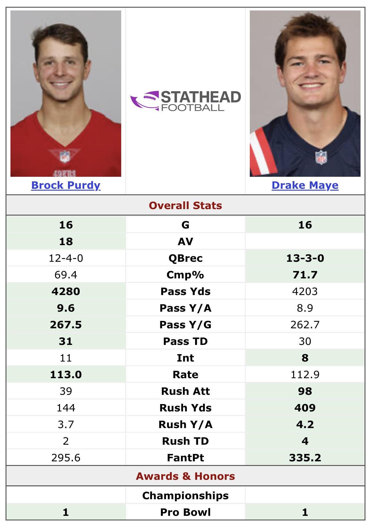 Drake Maye’s “MVP” Season compared to Brock Purdy’s 2023 Season
