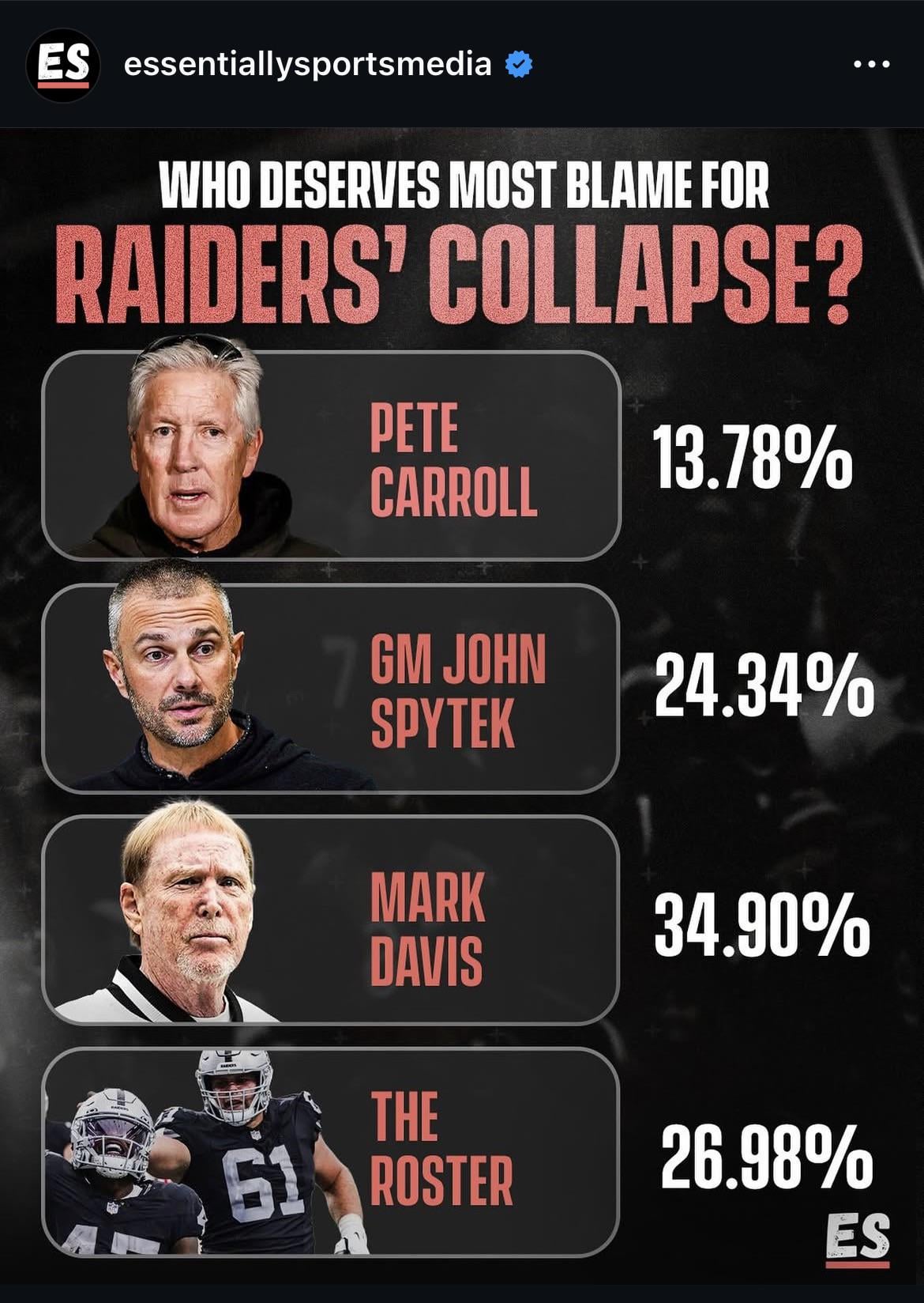 I mean at the end of the day the players play so I’m unsure why they don’t get more of the blame. Also the roster overall just sucks. It’s not like there are multiple all pros on both sides of the ball. In fact, if there was an anti-all pro team the raiders might have the most players. They’re not even average, they’re flat out terrible.