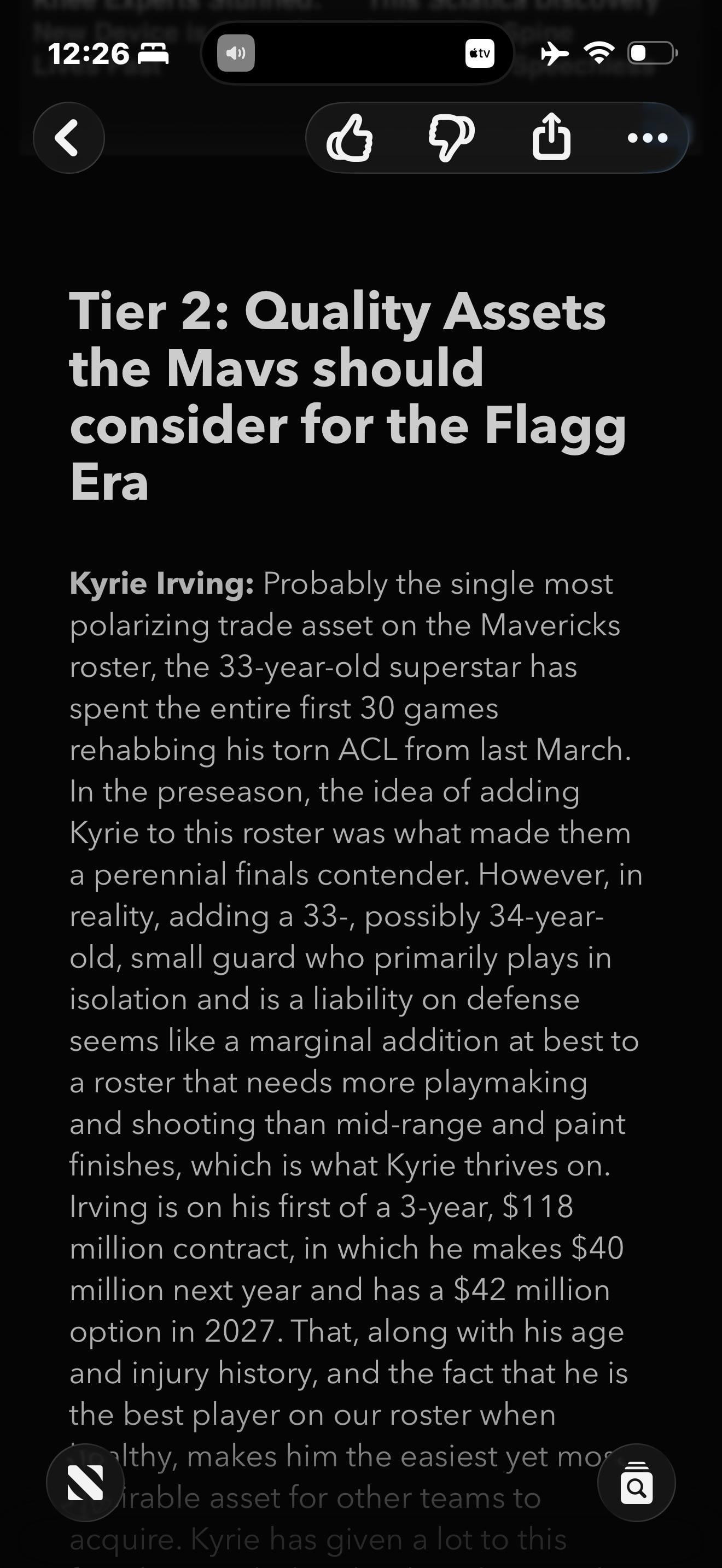 Kyrie seems untradeable so this is all cope. 33 going on 34, has an extensive injury history missing long stretches. Suffered once of the worst tears for a perimeter player who relies on stopping on a dime quickness, also has the rep of being a potential cancer in the wrong situation. Plus Kyrie will be a shell of himself the remainder of this year. He is not Adrian Peterson