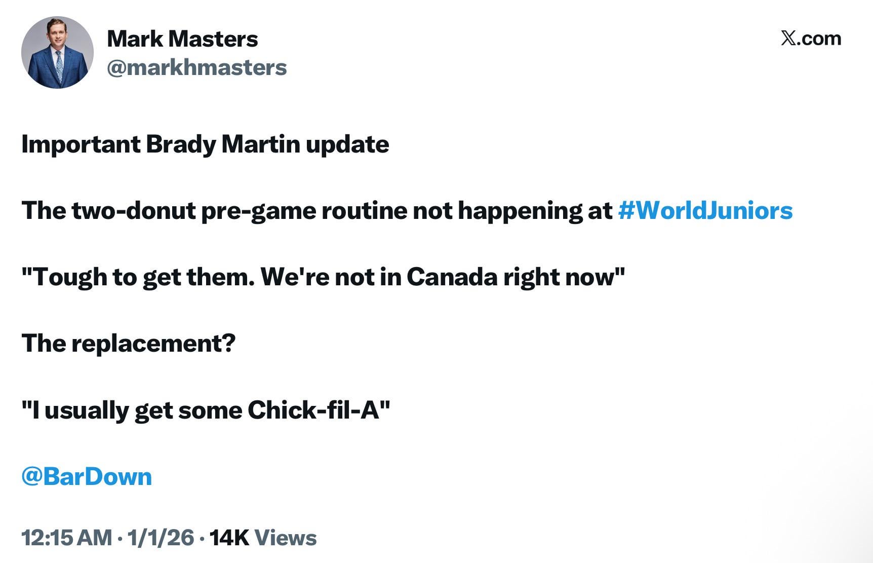 Brady Martin has replaced Tim Hortons with Chick Fil A 5 comments I look forward to Sunday’s report on this matter [deleted] I suppose, if no other donut will do, fried chicken sandwiches is a possible substitute I’m liking this kid more and more. A young man of culture. okay but like what’s his order? that’s the real question Leave a ReplyYou must be logged in to post a comment.