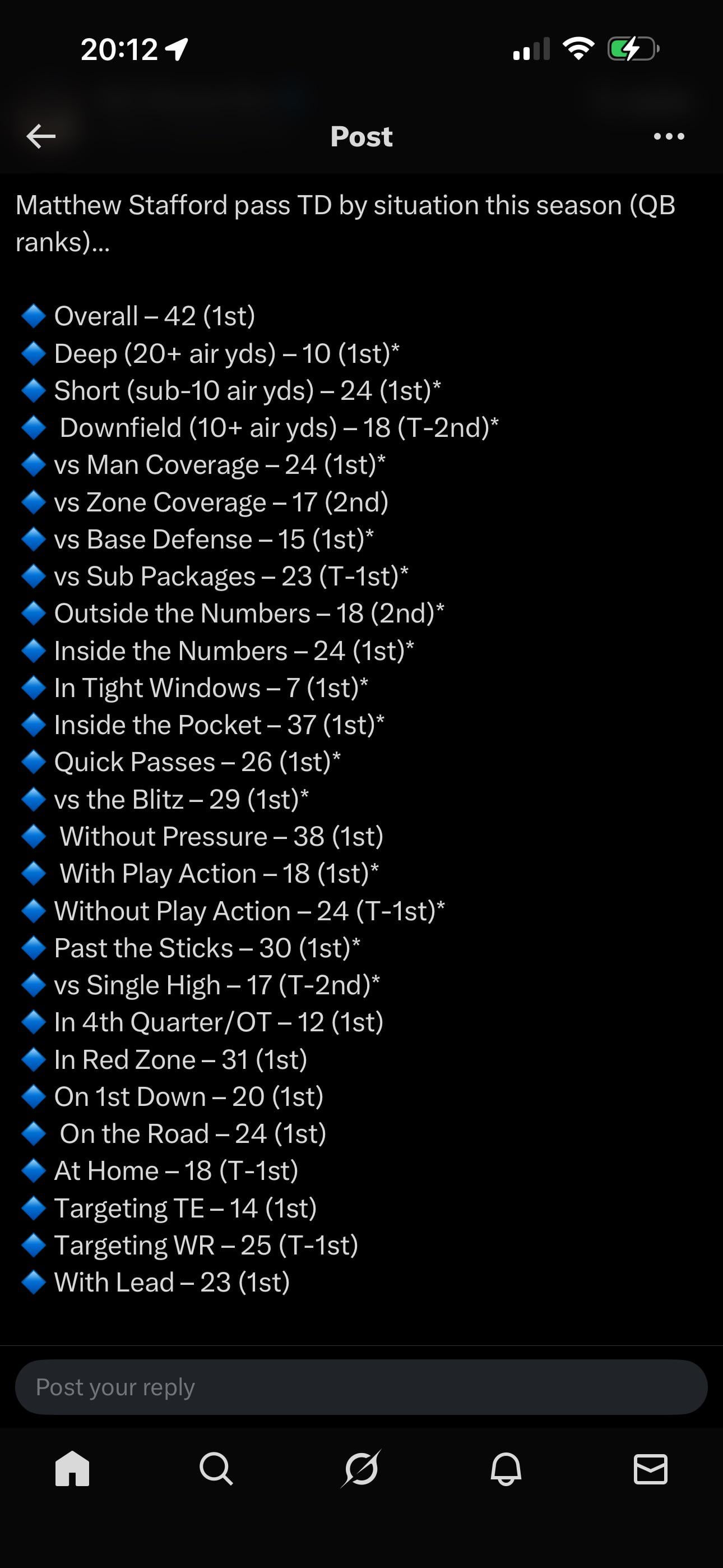 Every touchdown throw by situation from Stafford – how this is ignored baffles me