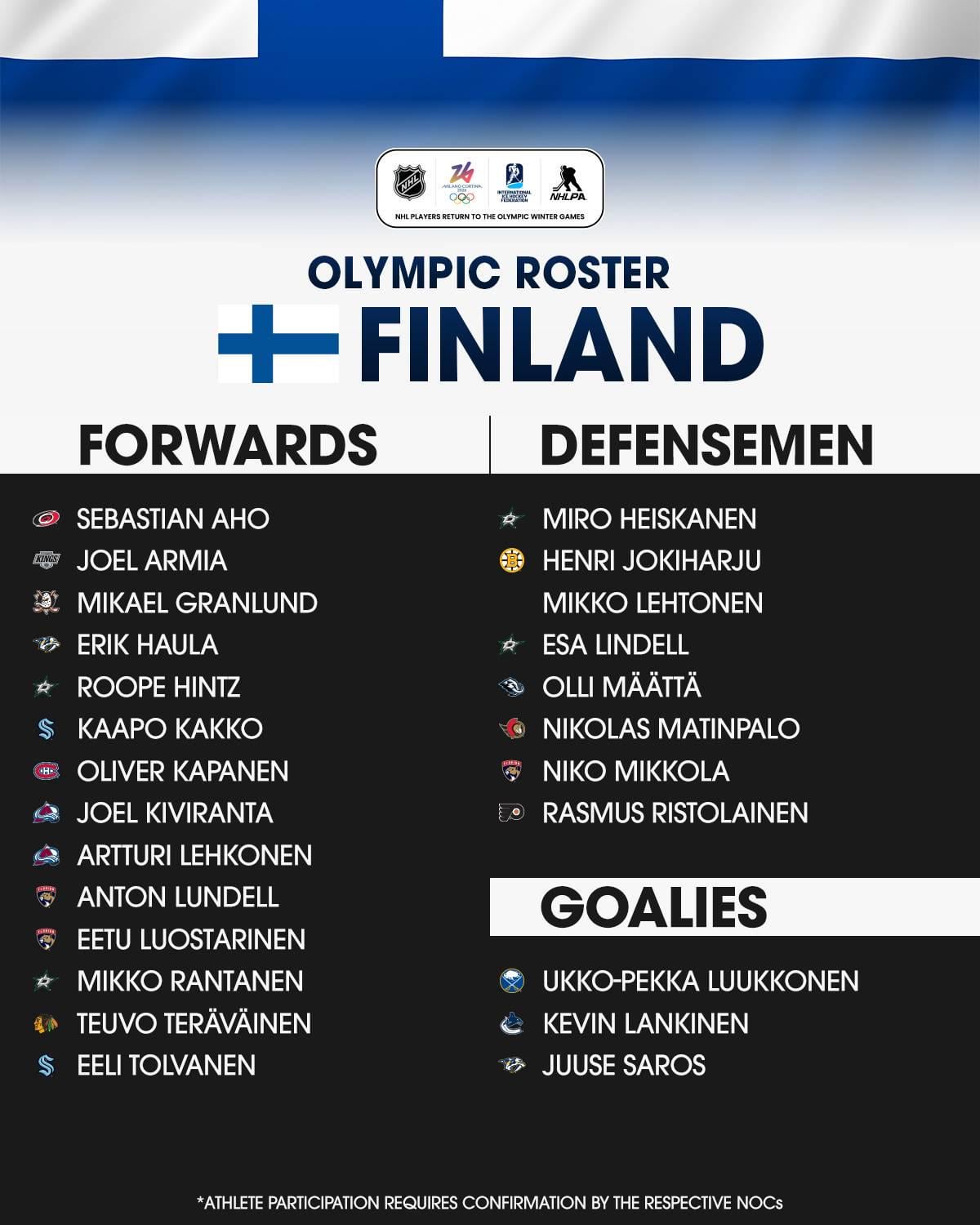 Team Finland Olympic roster. Congrats to Tolvanen and Kakko!!