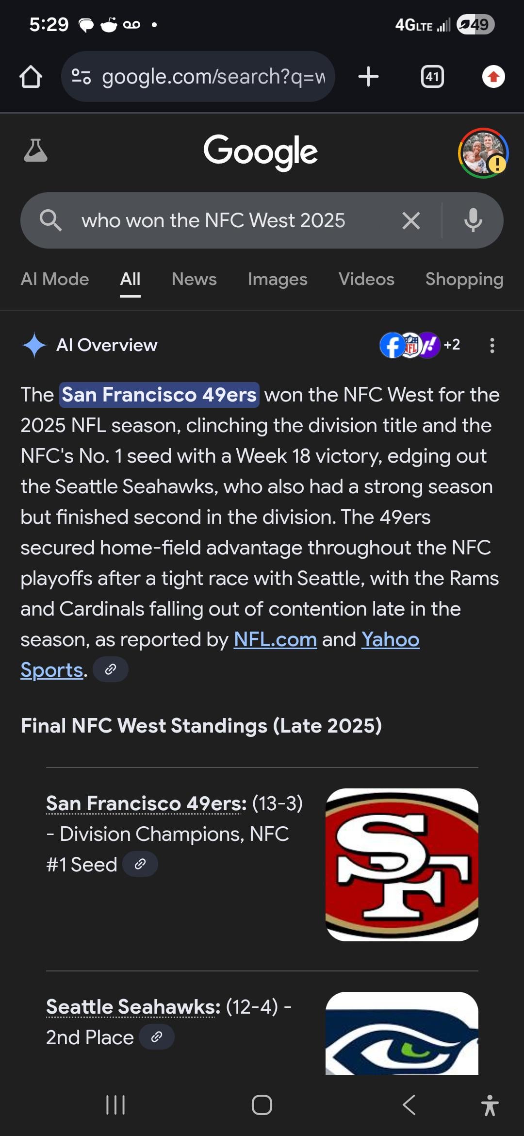 It’s now saying the Seahawks won with a week 17 victory over the 49ers. I think Google has been drinking again…