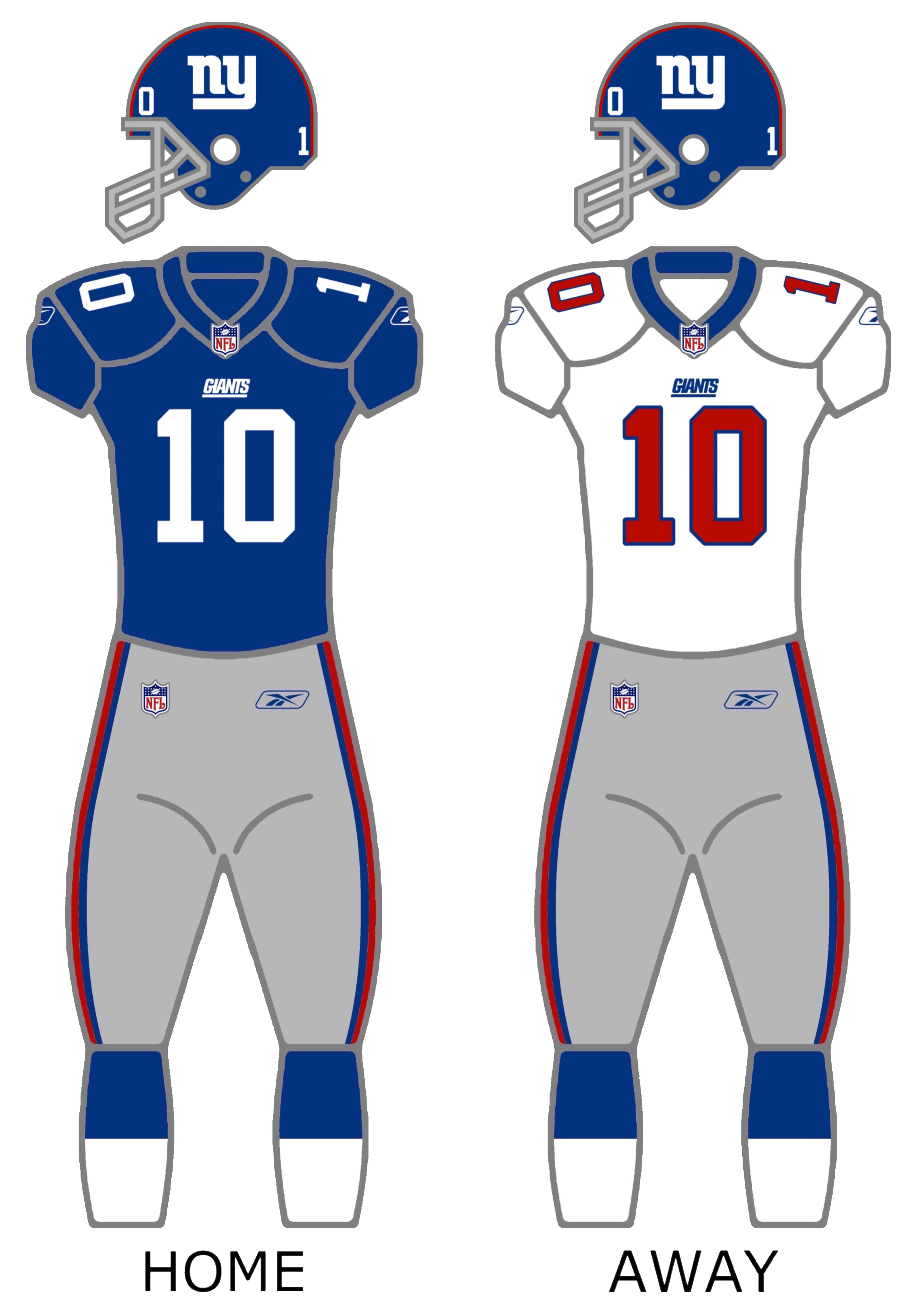 10. I like the grey pants, plain white numbers for home, and the grey pants, white with red numbers with no piping for away. Basically the uniforms from Eli’s second year, 2005 and on. These uniforms were basically throwbacks to the classic uniforms of the 50s and 60s, which I like more than the italicized GIANTS with the underline. But anyway, the Giants being a classic NFL franchise being known simply as “Big Blue” for so many years, the Giants really can’t change their style too much without upsetting the fans, so there isn’t going to be a drastic change.