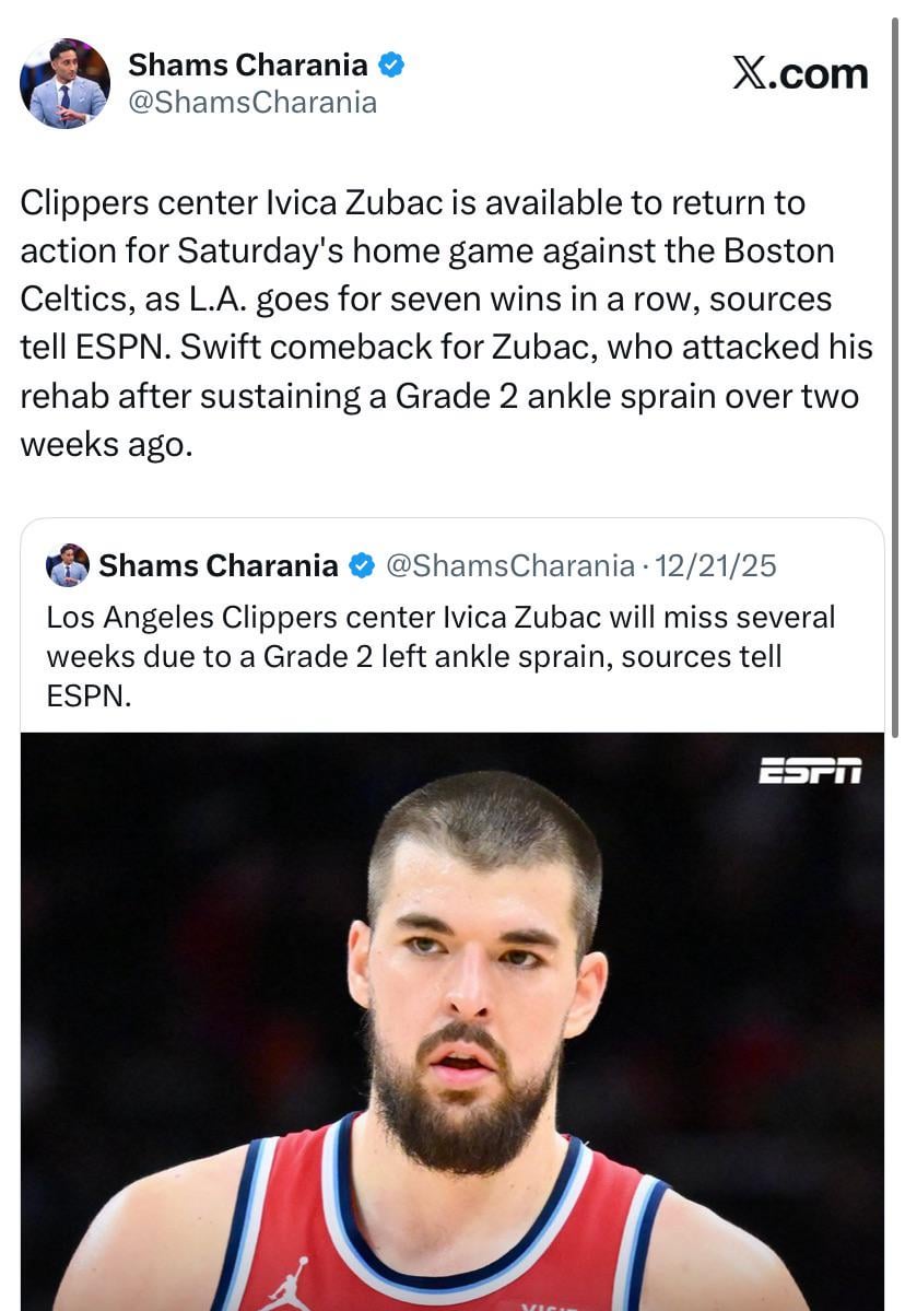 [Shams] Clippers center Ivica Zubac is available to return to action for Saturday’s home game against the Boston Celtics, as L.A. goes for seven wins in a row, sources tell ESPN. Swift comeback for Zubac, who attacked his rehab after sustaining a Grade 2 ankle sprain over two weeks ago.