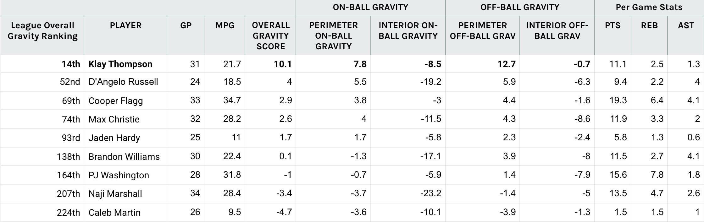 Note: I'm guessing AD hasn't played enough yet this season for his gravity to be quantified, which is why he's not listed in the table as his stats aren't available (same goes for Nembhard, Gaff, DLive, etc.). For reference, there are 266 players for whom there are Gravity stats available, which is what leads me to the conclusion that it's a playing time/games played threshold reason for why the aforementioned Mavs aren’t among the available player stats.