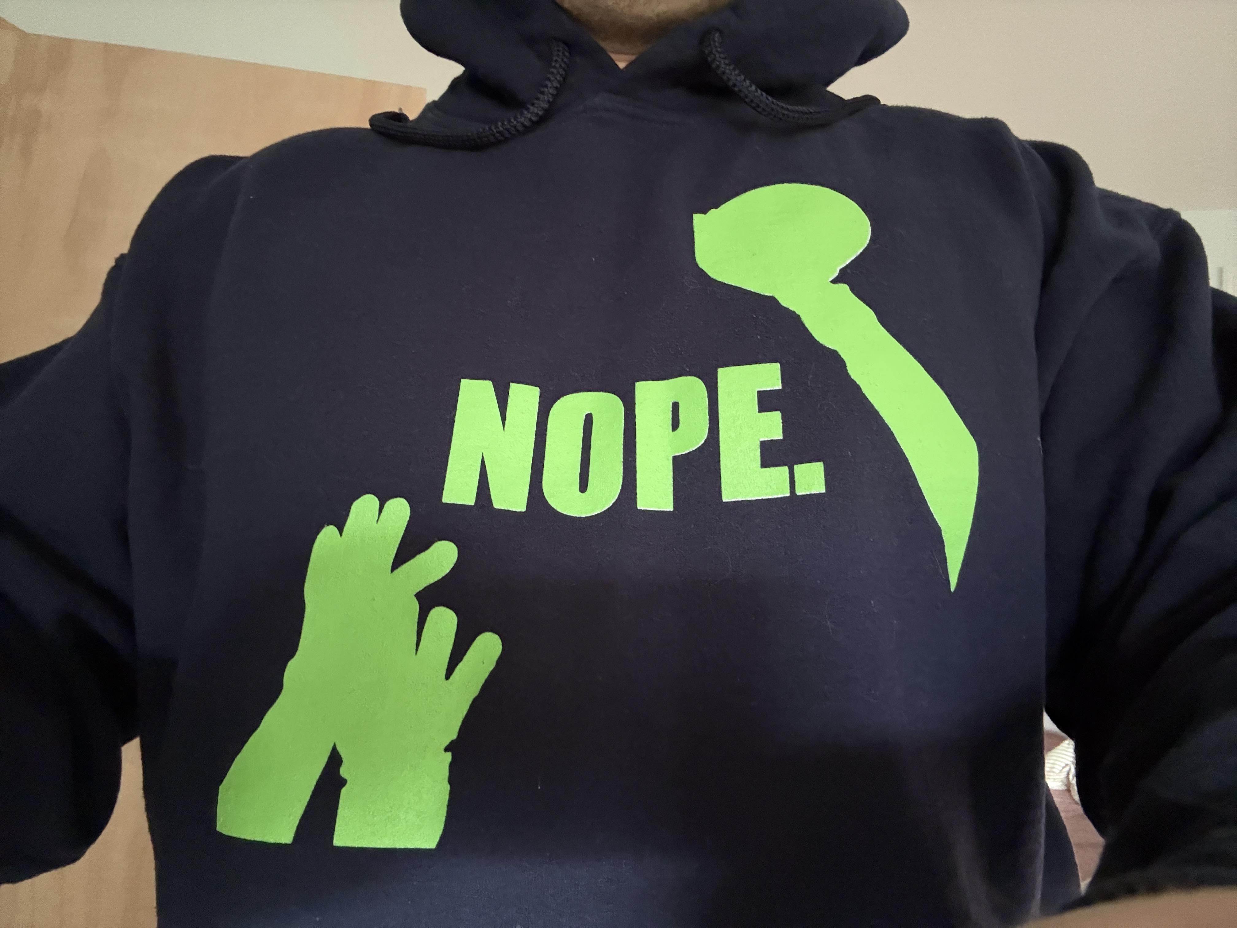 I have this t-shirt, but we’ve lost every time I’ve worn it, so it remains in the drawer.