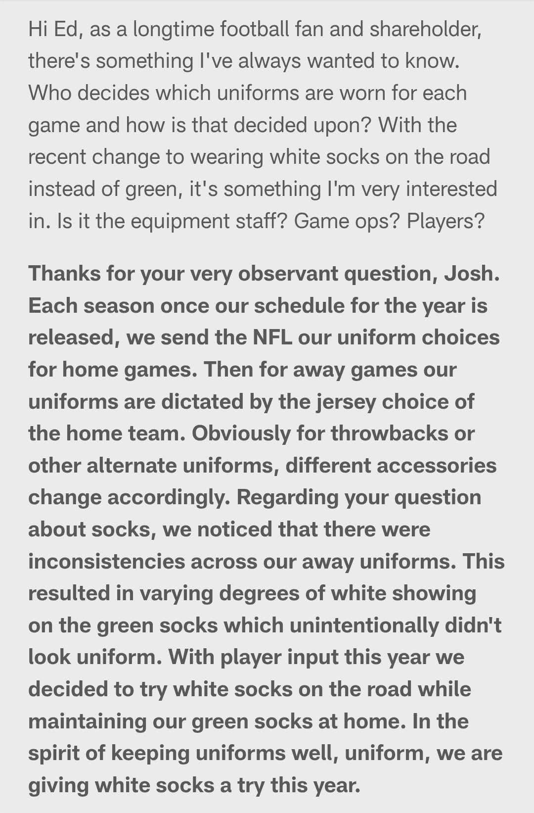 Really interesting part of an Ed Policy Q&A. I have despised the white socks the Packers have worn with their white jerseys this year but Ed’s explanation makes sense; better to have everyone wear white than have vast inconsistencies in the uniform. Still, why not just enforce uniformity with the green socks? Here’s hoping it’s just a one year experiment.