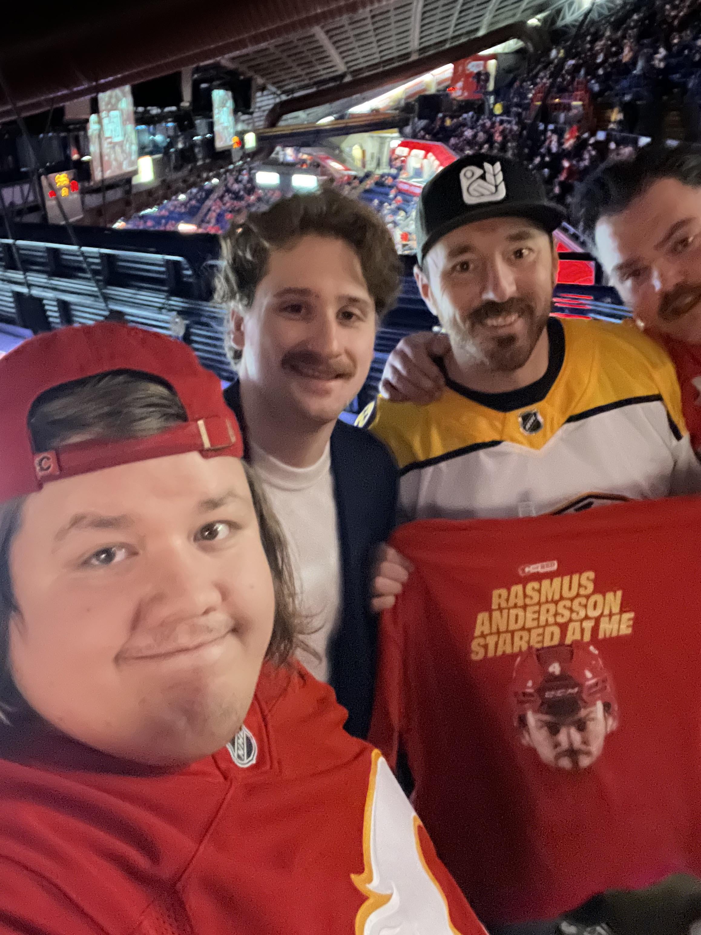 That mustache is greeeeeasy. lol ๐ It was a fun moment the one dude stared back at him. You would think the Flames could have sprung for two shirts though? haha. ๐