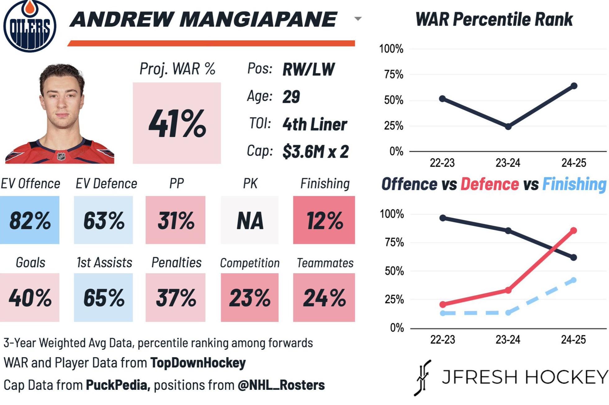 The funny thing is depth players usually dont do well in Edmonton because of the big 4 get all the minutes (similar to how Toronto was with the core 4). Mangiapane could be more productive here 40-50 points in a full season so it is worth the risk in my mind. Especially if we send someone like Strome or Killorn.