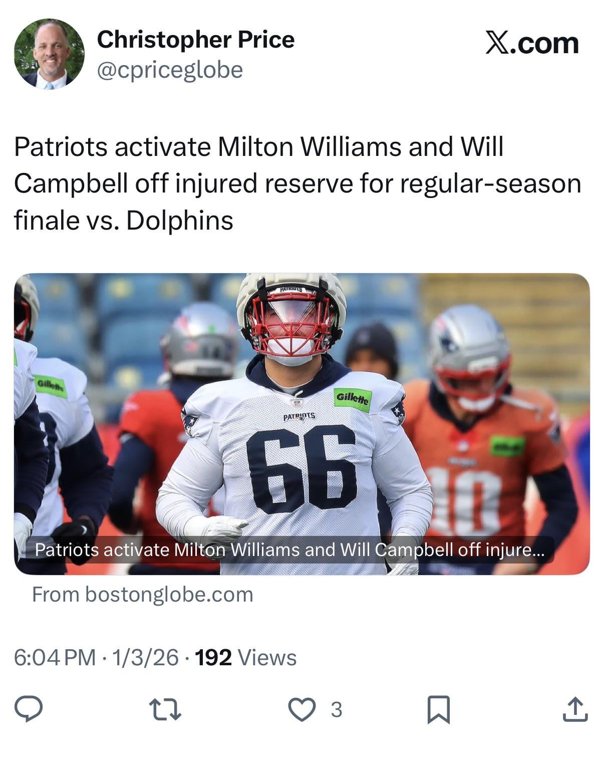 Patriots activate Milton Williams and Will Campbell off injured reserve for regular-season finale vs. Dolphins 11 comments Let’s gooooooo! Who did they cut to open a roster spot I’m glad. Getting healthy at just the right time League fucked. LFGGGGGGG We know. This has already been posted. Fuck yea let’s go Of course Chargers/Broncos is at the same time as ours. Gotta protect the odds. Knock that rust off!!! Gotta get some reps in to shake off a bit of rust before the playoffs. It’s gonna be so clutch to have these guys back. Leave a ReplyYou must be logged in to post a comment.