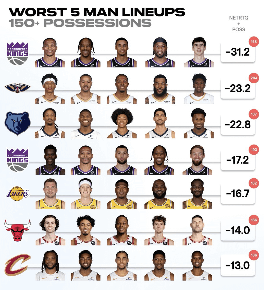 Notably, the lineup is the one with the most possessions. I would presume this was a WG lineup likely caused by injuries.