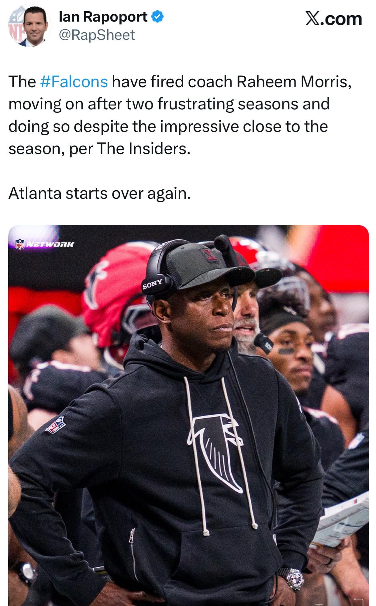 The Falcons have fired coach Raheem Morris, moving on after two frustrating seasons and doing so despite the impressive close to the season, per The Insiders. Atlanta starts over again.