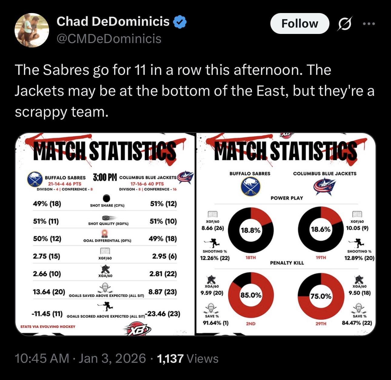 [Chad DeDominicis] The Sabres go for 11 in a row this afternoon. The Jackets may be at the bottom of the East, but they’re a scrappy team.