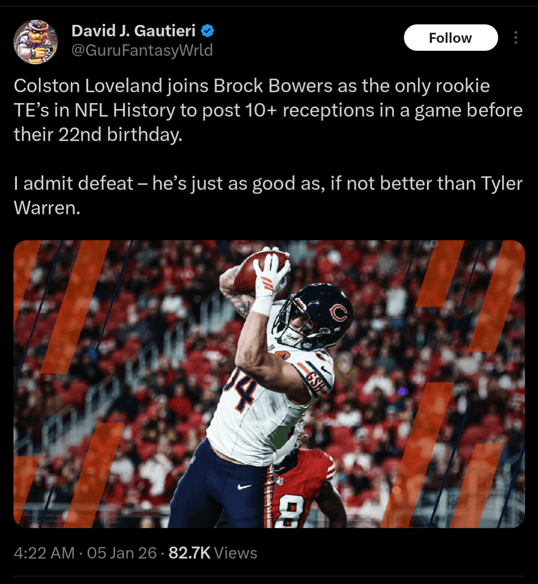 [David J. Gautieri] Colston Loveland joins Brock Bowers as the only rookie TE’s in NFL History to post 10+ receptions in a game before their 22nd birthday.