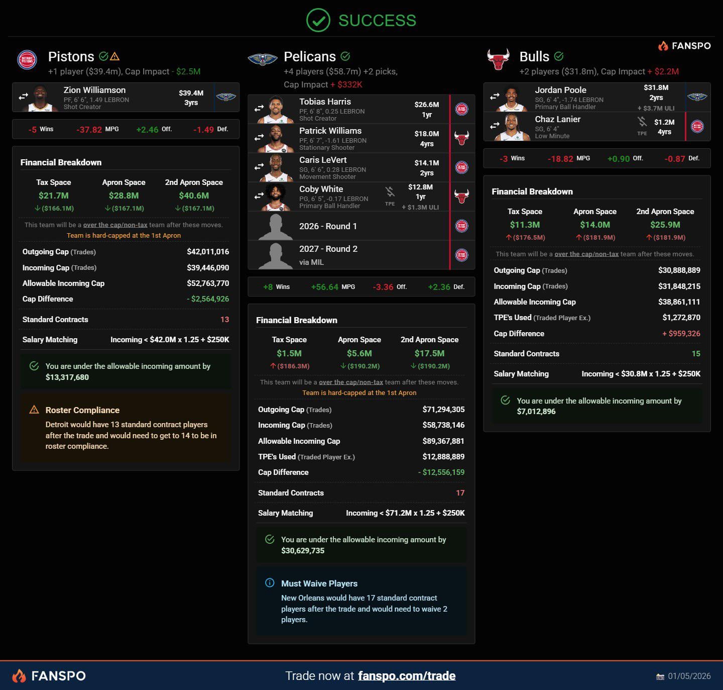 2.) Bulls would never agree to this. They are basically downgrading their roster to help Detroit get Zion.