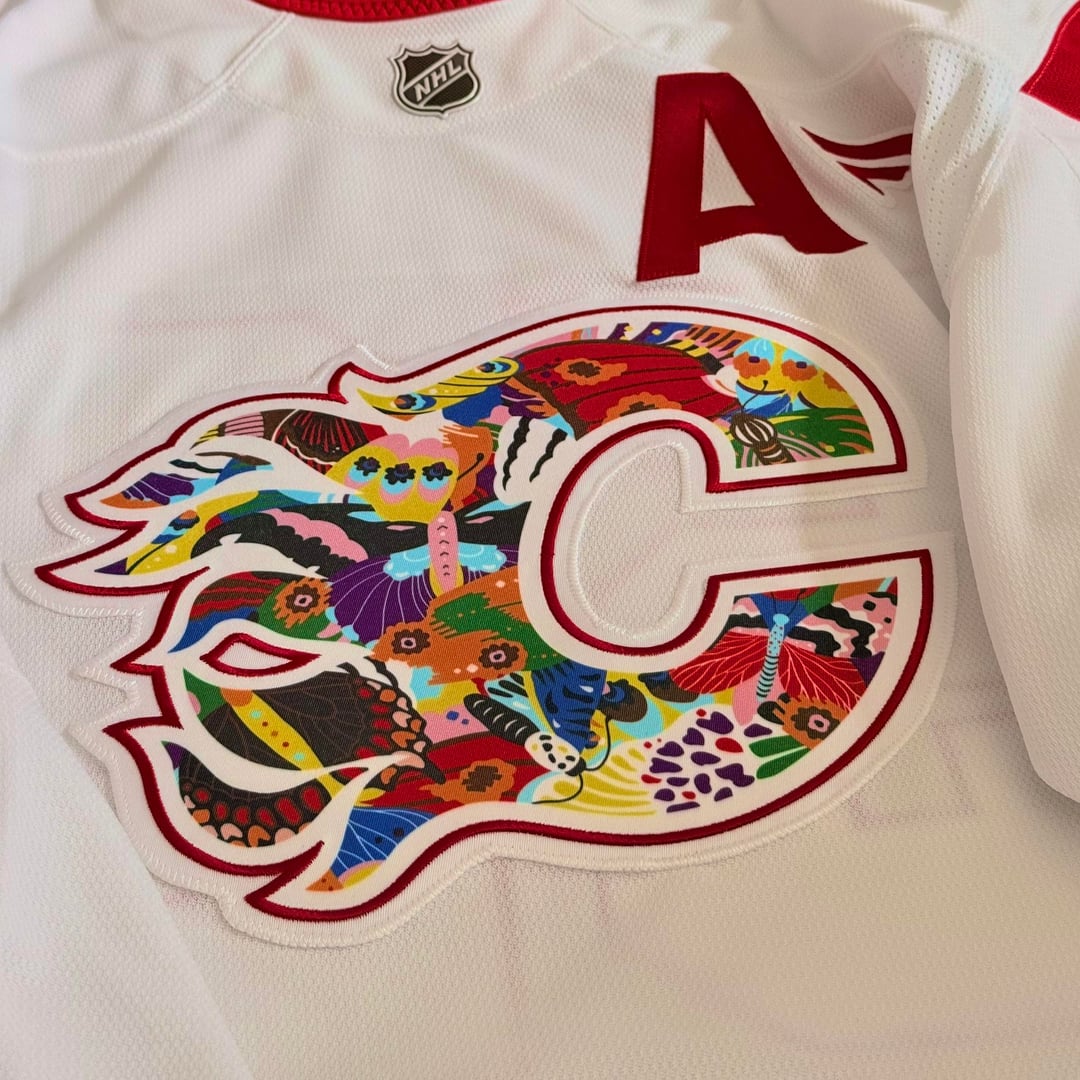 Tonight is pride night at the Dome, and I wanted to share the practice jersey. I was lucky to've won at last years Pride Night. The jersey was designed by Sarah Slaughter with proceeds directed to the Calgary Flames Foundation CSEC Inclusion Program and Big Brothers Big Sisters PRISM Program