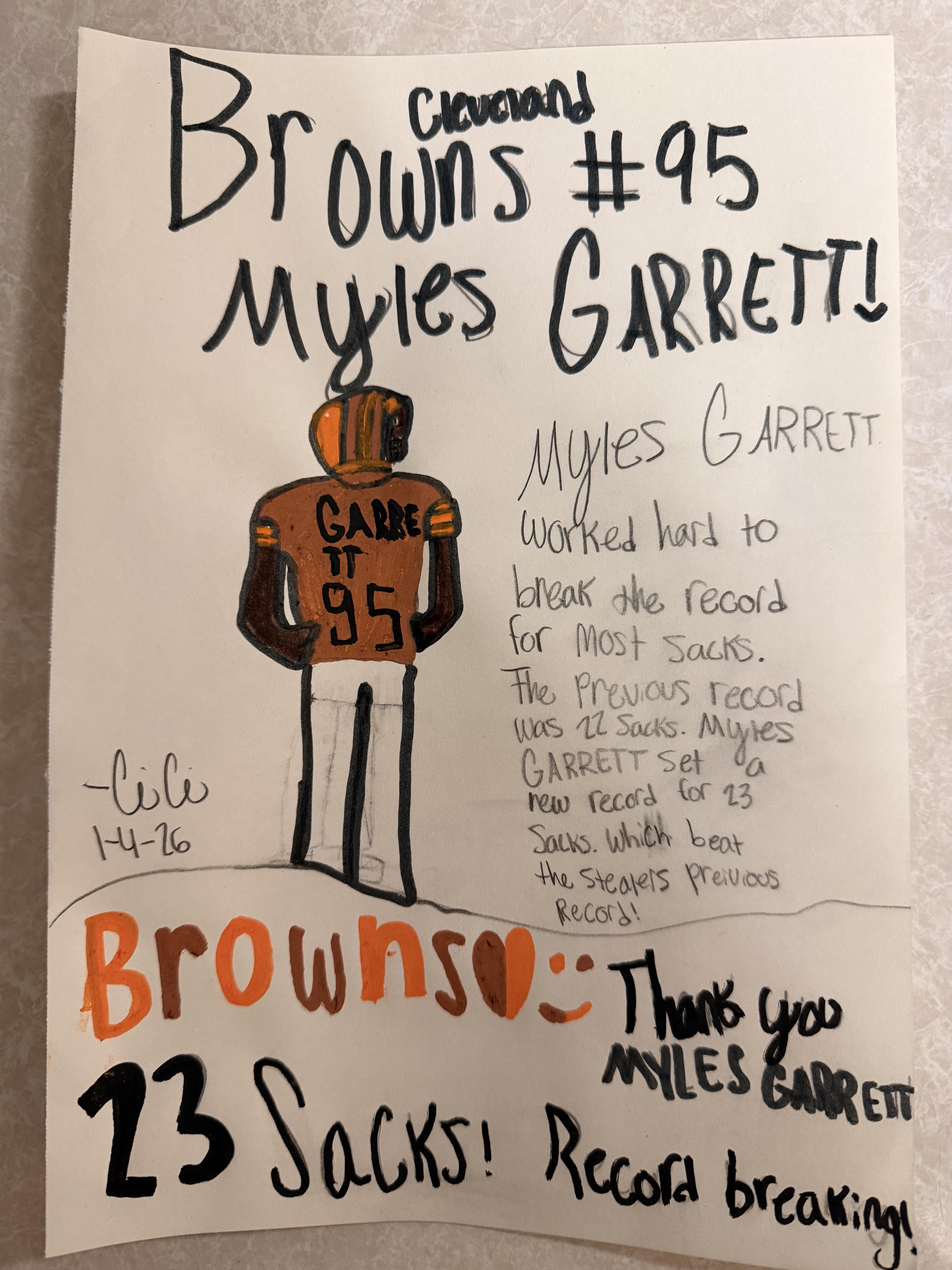 A drawing my daughter made for Myles Garrett’s sack record. Cici (10 yrs old). She thought y’all may like it. 6 comments Very cool Cici! Great work kid! Thanks for the kind words. I will def let her know. She loves the feedback❤️ Very awesome! “MYLES GARRETT set a new record for 23 sacks. Which beat the Stealers preivious record!” still better journalism than some of the local cleveland beat articles Adorable Leave a ReplyYou must be logged in to post a comment.