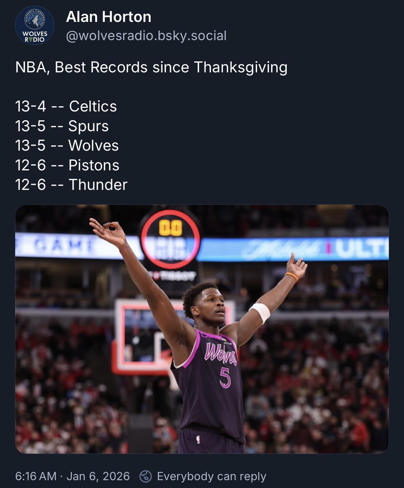 Wolves need to keep playing like this. The games vs the Hawks and Nets were embarassing, but we’ve been generally good over this stretch. We do still badly need more bench. Our starters have been great, but god outside of Naz it can be so bad.