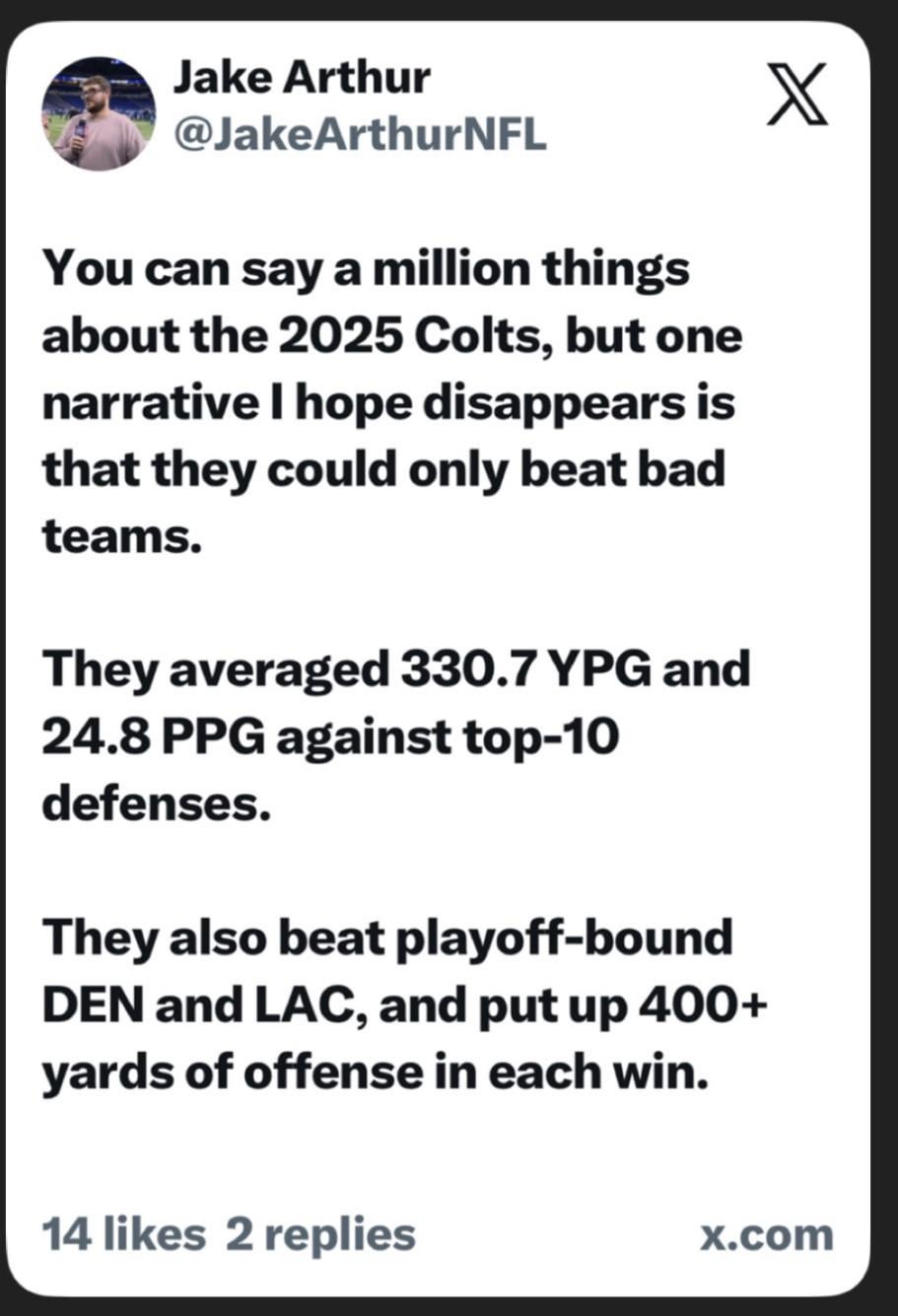 Yep, they beat 2 of the many playoff teams they played. I’m not sure this narrative will fade. If the Colts don’t like it then beat good teams more.