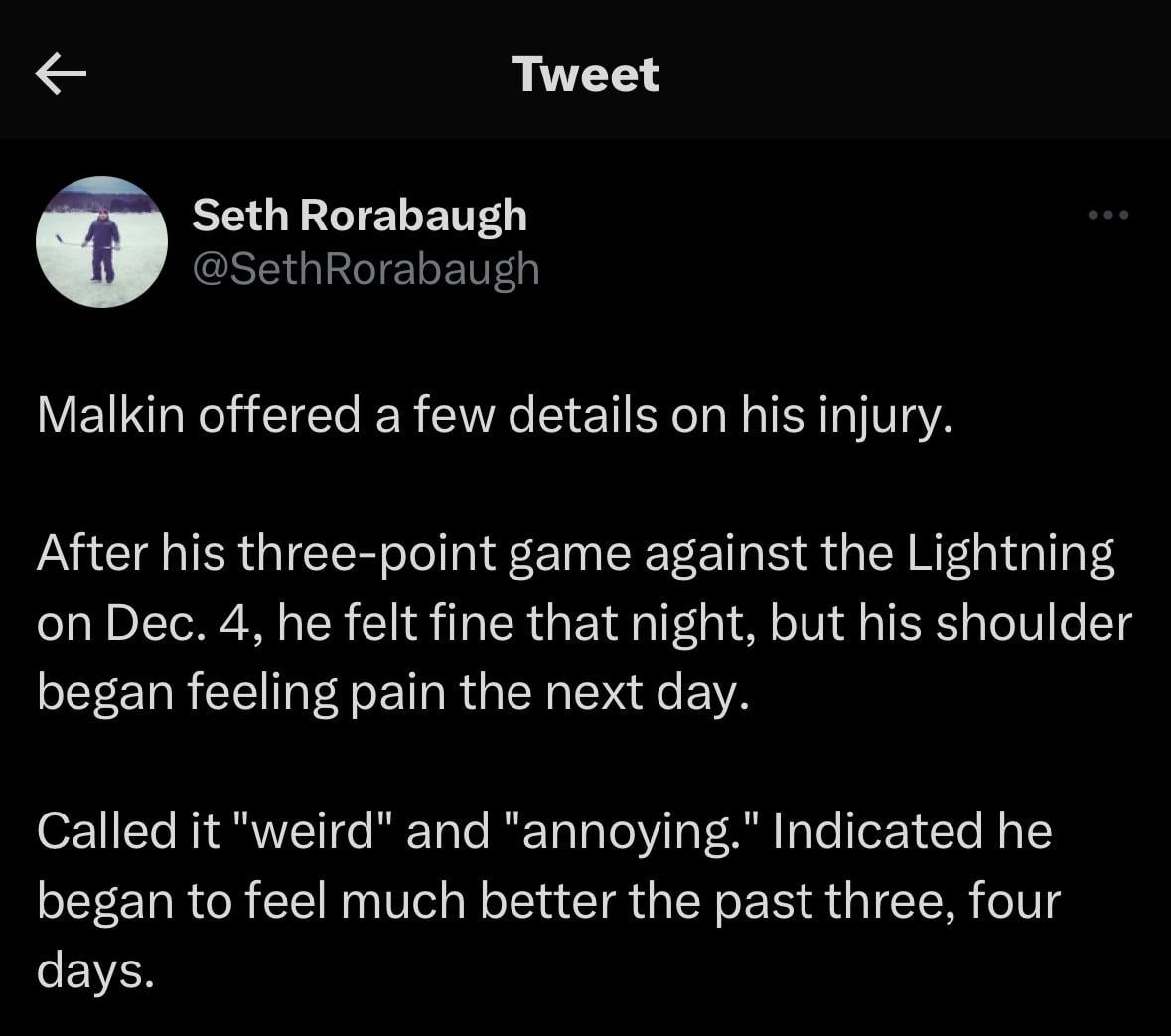 [Rorabaugh] Malkin offered a few details on his injury. After his three-point game against the Lightning on Dec. 4, he felt fine that night, but his shoulder began feeling pain the next day. Called it “weird” and “annoying.” Indicated he began to feel much better the past three, four days.