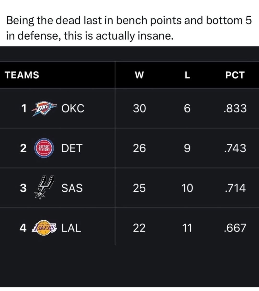 For all the recent diatribes on this subreddit, if you didn’t look at their record, you’d think they’re 11-22. This isn’t a bad team. Yes, we have deficiencies. Glaring deficiencies. But we are also banged up. And, let’s be real, we are 6-6 the past 12 games. Guess who else is 6-6 the past 12 games? The “vaunted“ OKC Thunder, who just got blown out by the Hornets last night, in OKC.