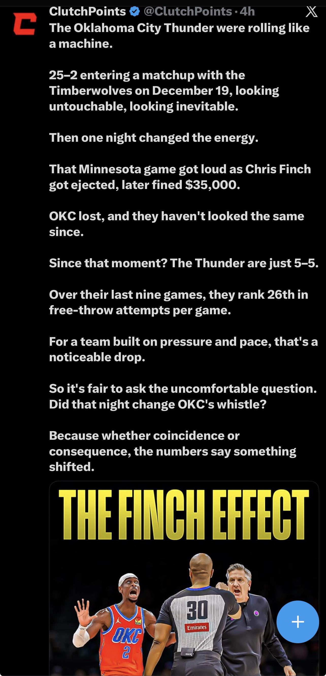 – last Finch Effect. And not in the way people point to. Finch’s outburst I believe was more about discrepancy in the whistle. OKC got a long leash on defense and a soft whistle on offense. Their FTAs have been similar since Finch’s ejection but their defense appears to be whistled tighter and their opponents TOs have dropped. Outside SGA they are not that impressive in the half court and the drop in opponent TOs has decreased fast breaks and efficiency.