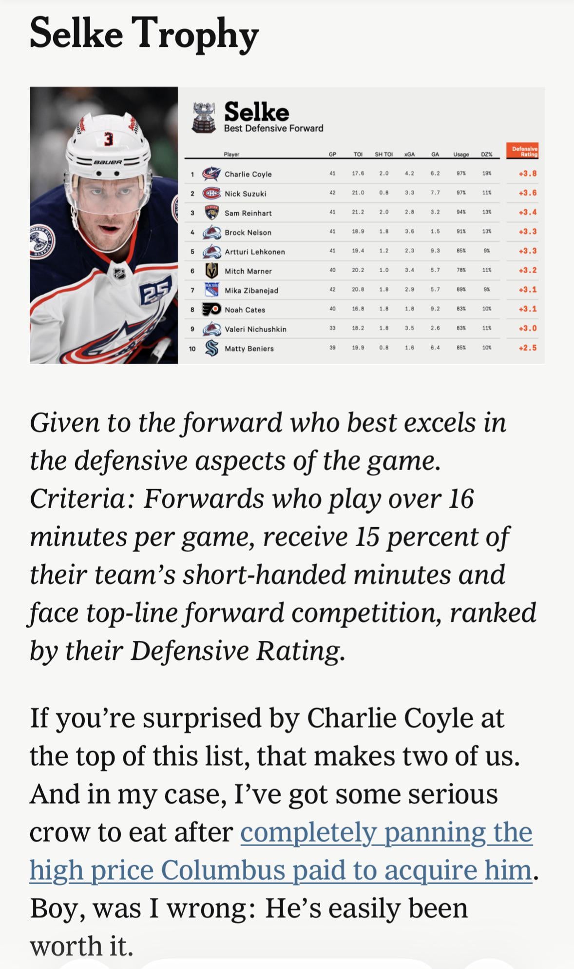 Charlie Coyle leads the athletic analytics Selke Trophy at the midway point of the year 7 comments Imagine if this guy actually watched him play. He’d be the clear #1 the eye test confirms the numbers on this one. I also wonder what Makar looks like without his all star team around him. If you swap him and Z, do they also swap places on the list? Hell Yeah Charlie Coyle!! Coyle has been great. Him and Wood together have been a great trade, and it’s especially impressive for a 3rd line center in a not very good team Hot take: I would rather re-sign him than Boone (he would probably be somewhat less money, too) Love to see it! “Completely panning the high price Columbus paid to acquire him.” Basically a 2nd and a prospect is a high price? Fuck off. > I’ve got crow to eat I feel like he’s saying that a bit more often about us Leave a ReplyYou must be logged in to post a comment.