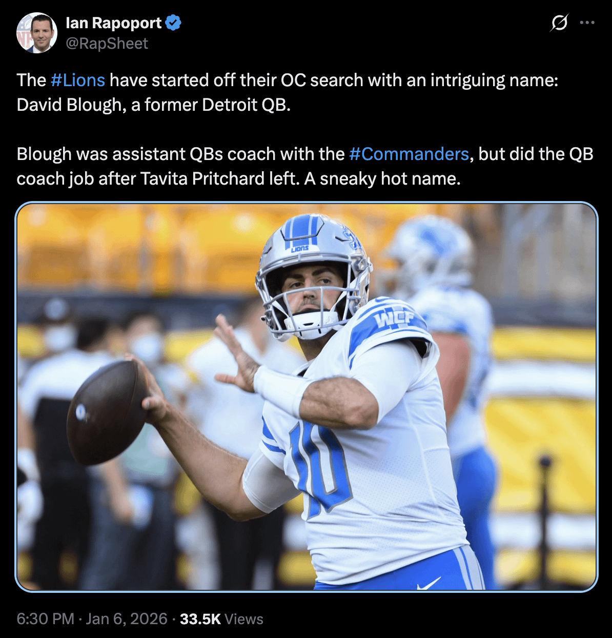 The Lions have started off their OC search with an intriguing name: David Blough, a former Detroit QB.