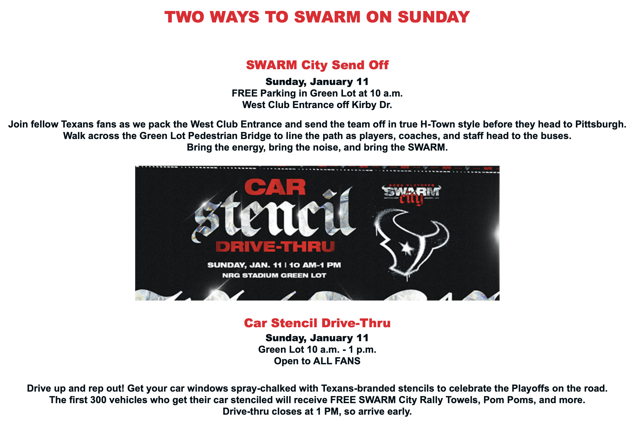 Join fellow Texans fans as we pack the West Club Entrance and send the team off in true H‑Town style before they head to Pittsburgh.