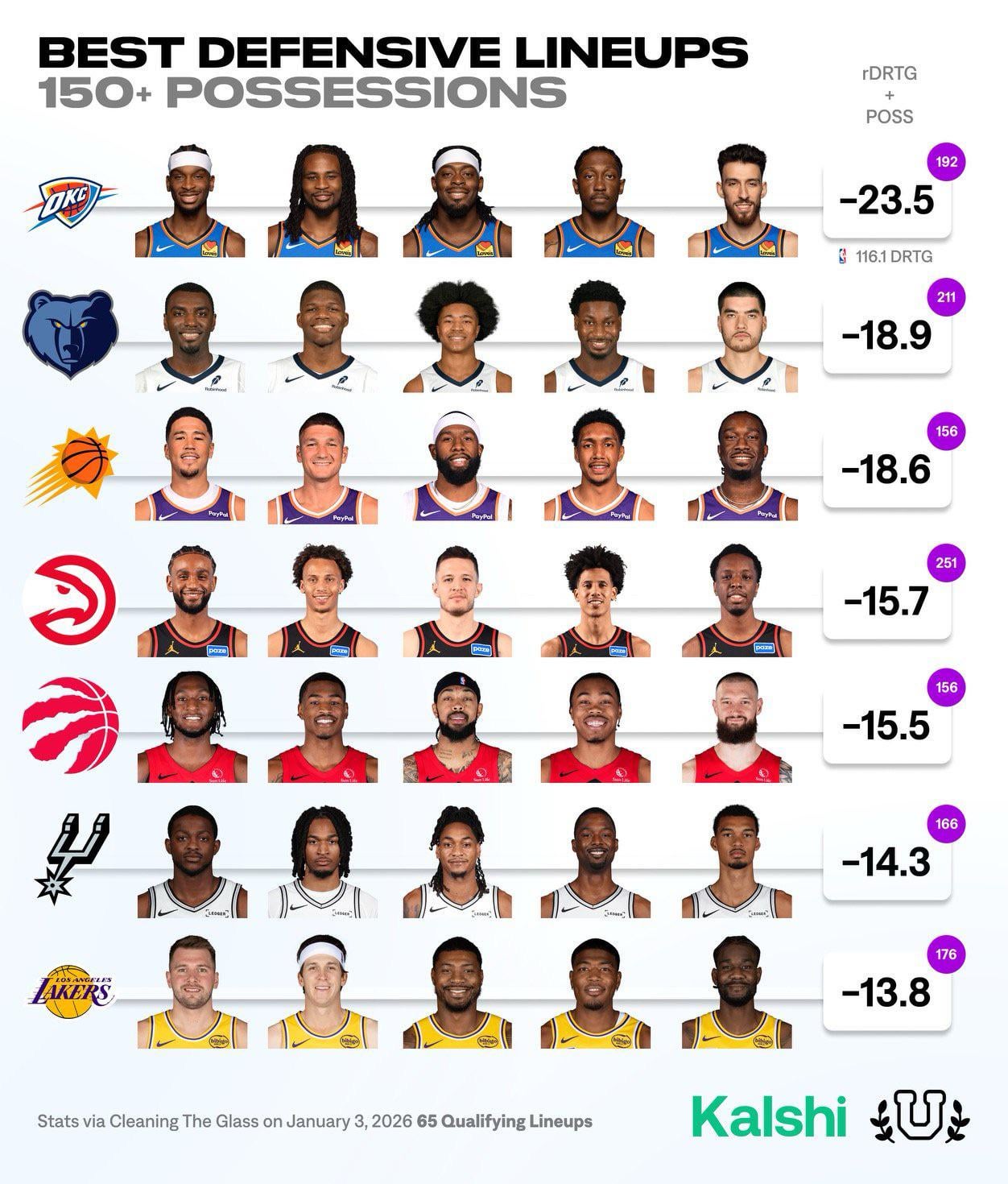 It’s impossible to overstate how much defensive potential that lineup has. Like, they played enough possessions make this list but still not that many possessions together when you think about it. Like, the league average is about 117ish points per team and teams average about 47% shooting from the floor, primarily two-pointers. So you figure you get about 110 possessions per team per game.