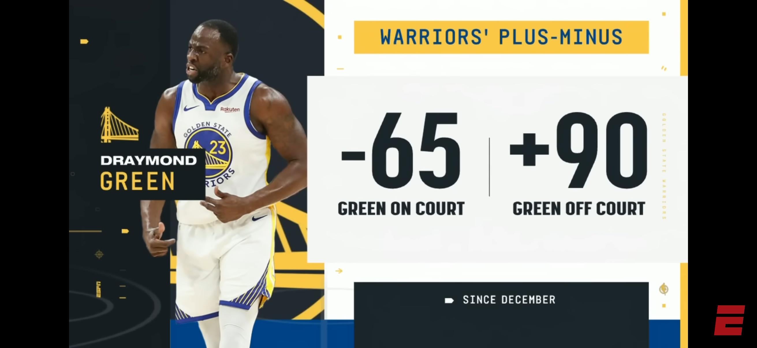 I know raw +/- is a very shaky statistic to use, and Dray will often be playing in lineups without Steph or maybe even without Steph and Jimmy, but still, this year it genuinely feels like we often play better without him.