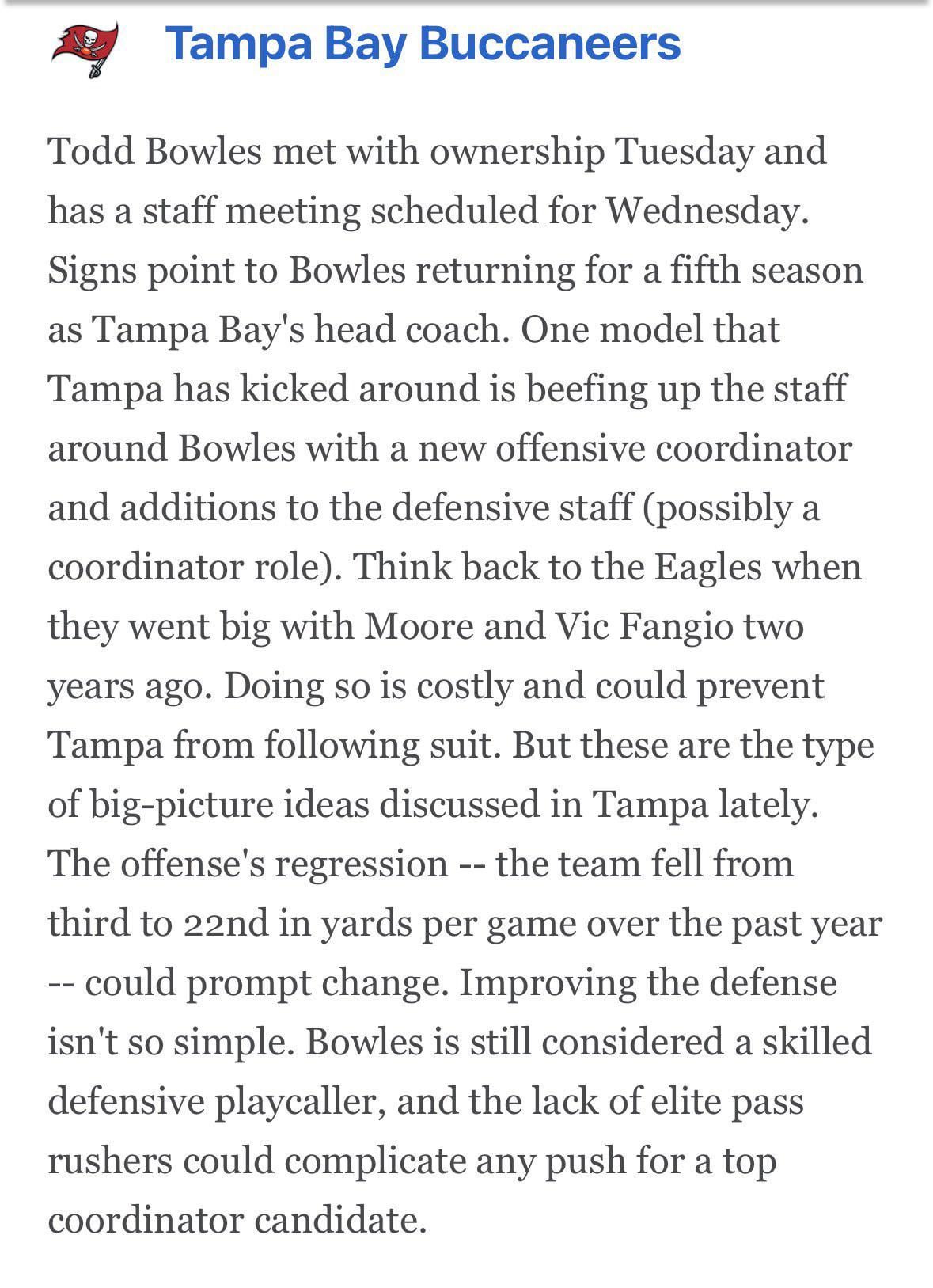 Excuse my ignorance but hasn’t word been from just about everyone they are meeting with Bowles on Wednesday, once more this is another “insider” basically saying I think he stays without any actual proclamation. On top of that why are we continuing to post and care about what anyone thinks is going to happen instead of just waiting for an actual announcement?