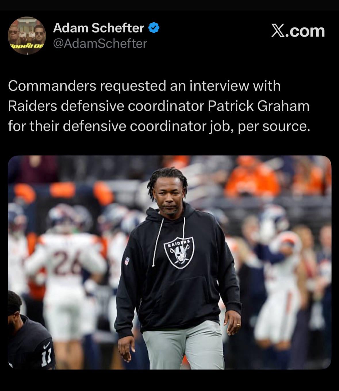 [Schefter] Commanders requested an interview with Raiders defensive coordinator Patrick Graham for their defensive coordinator job, per source.