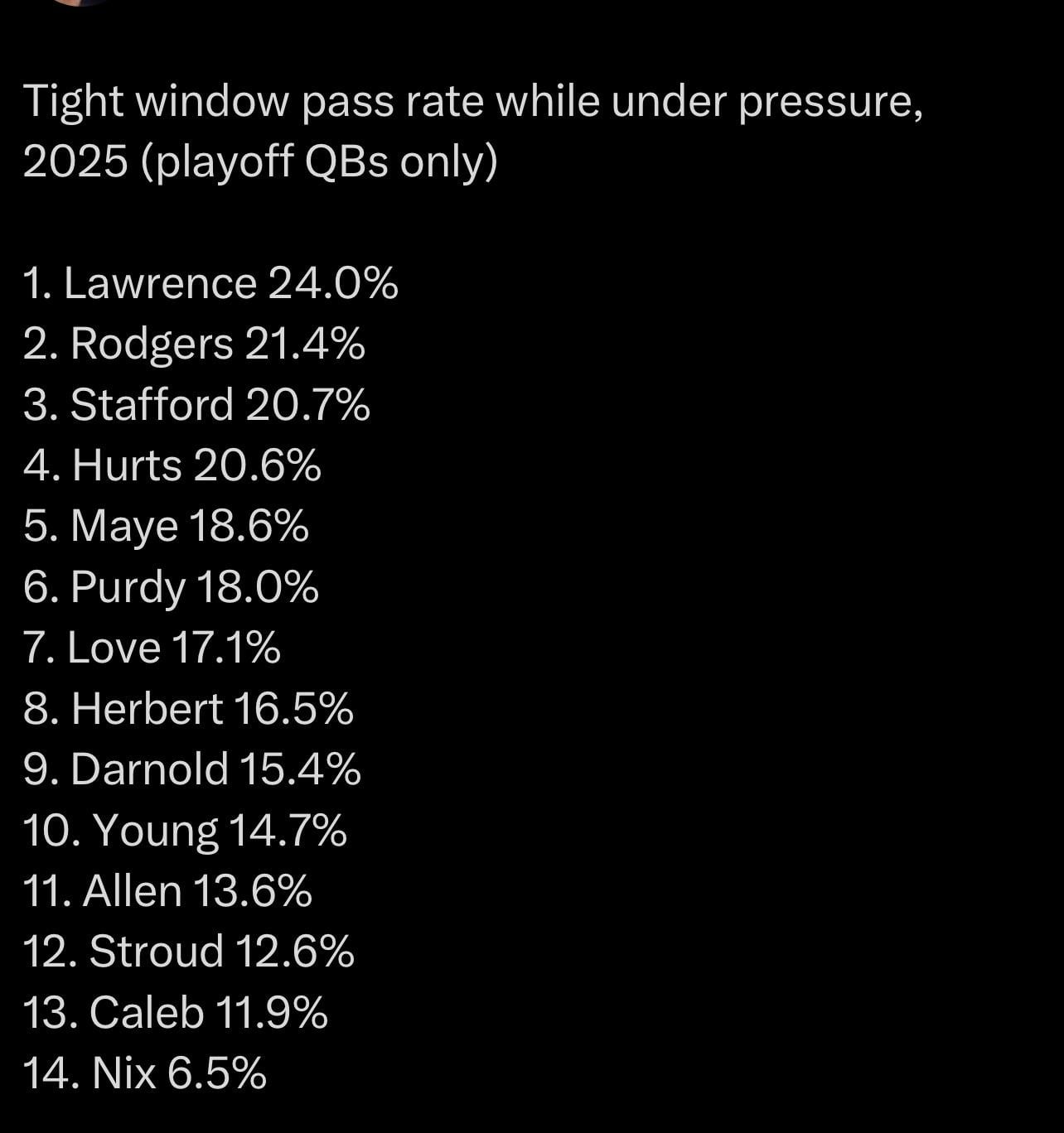 https://x.com/scottkacsmar/status/2009102386921406837?s=46&t=FpFflOWaIBpw-VtZB6L1eA 5 comments How do you measure the tightness?? Passes completed in tight windows, or attempted? A reflection of Trevor’s confidence. He is indeed, letting it rip. Our guy has literally been the best player in the NFL 2nd half of the season. Unreal. From the same thread https://preview.redd.it/73vijt8w55cg1.jpeg?width=1206&format=pjpg&auto=webp&s=70edf2dbc18816cd6f6d23aa806b55b772327380 Even at 13-4, our oline still our weakest unit. Imagine if they got better. Leave a ReplyYou must be logged in to post a comment.