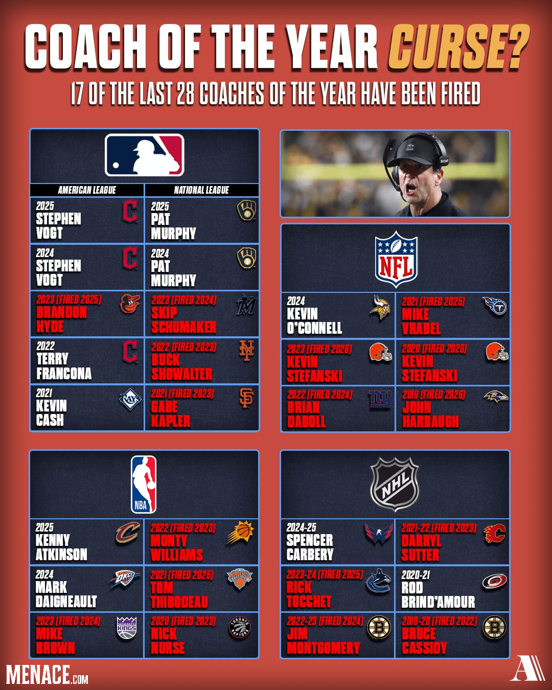 If you took all the coaches in any given year and mapped out when they got fired, how many got fired and when? I’m giving some coaches, the grace that they may have retired or stepped away from coaching. How does that compare to coach of the year getting fired. That might tell you something.